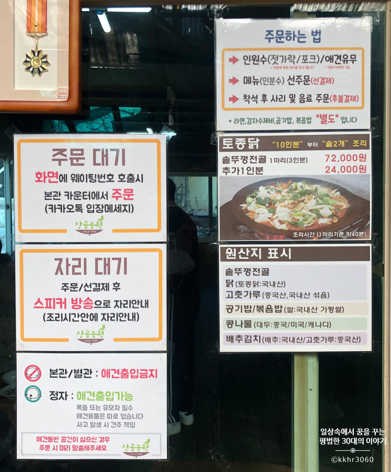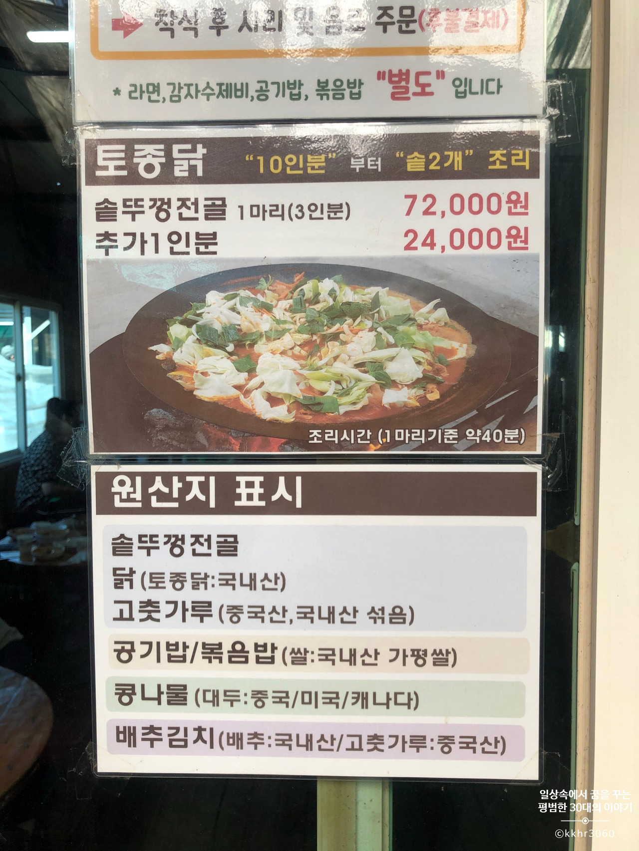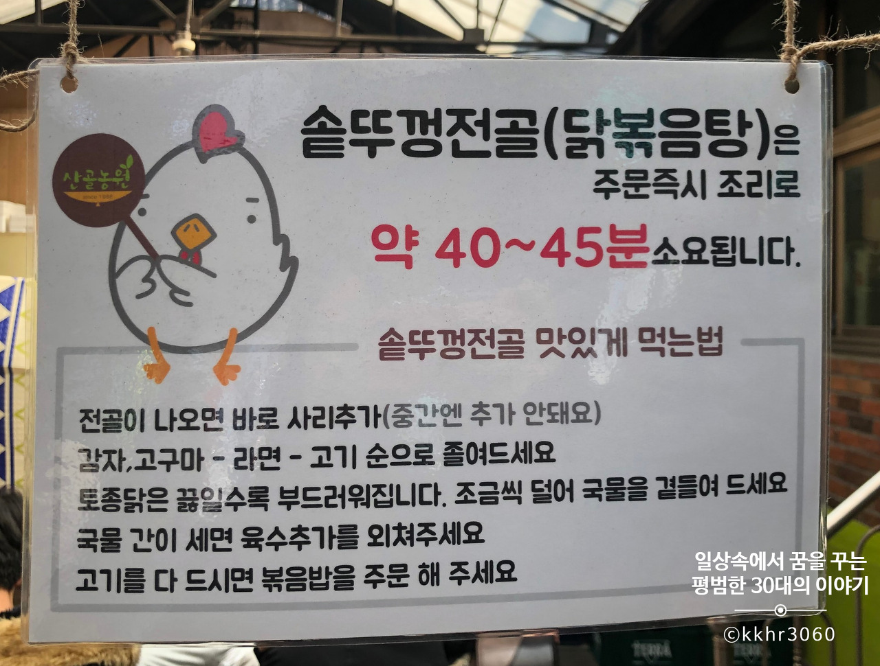 메뉴는 닭볶음탕 한 가지로 단출하다. 사이드로 라면, 감자수제비, 공깃밥, 볶음밥 주문이 가능하다. 대기번호를 카카오톡으로 받은 상태에서 한 40~50분 정도 기다리니 앞에 5팀 정도 남았을 때 주문을 받았다. 우리는 네 명이서 방문했으므로 솥뚜껑 전골 1마리 (3인분 72000원)을 주문했다. 가격이 상당히 비싼 편이다. 주문과 동시에 우리의 솥뚜껑 전골이 만들어지기 시작한다. (조리시간이 40분 정도 소요 됨) 앞에 대기 5팀이 빠지는 데까지 한 40분이 걸릴 거라 생각하고 이쯤부터 주문을 받기 시작하는 것 같다.