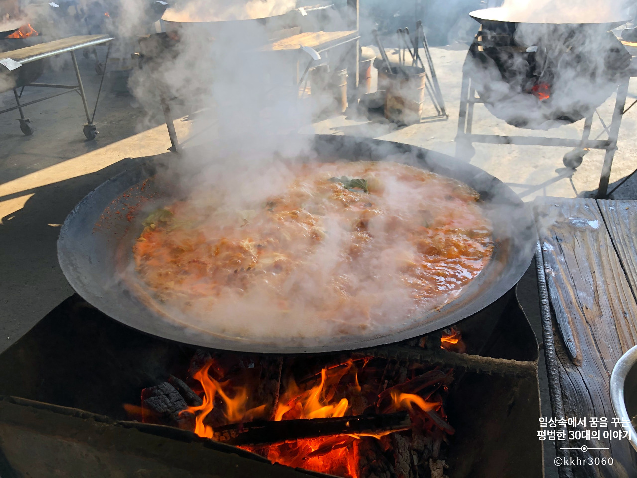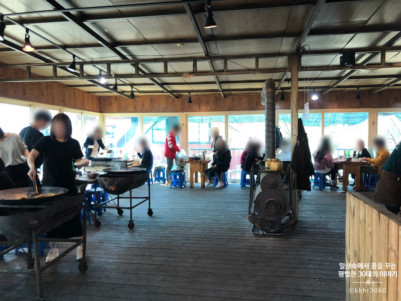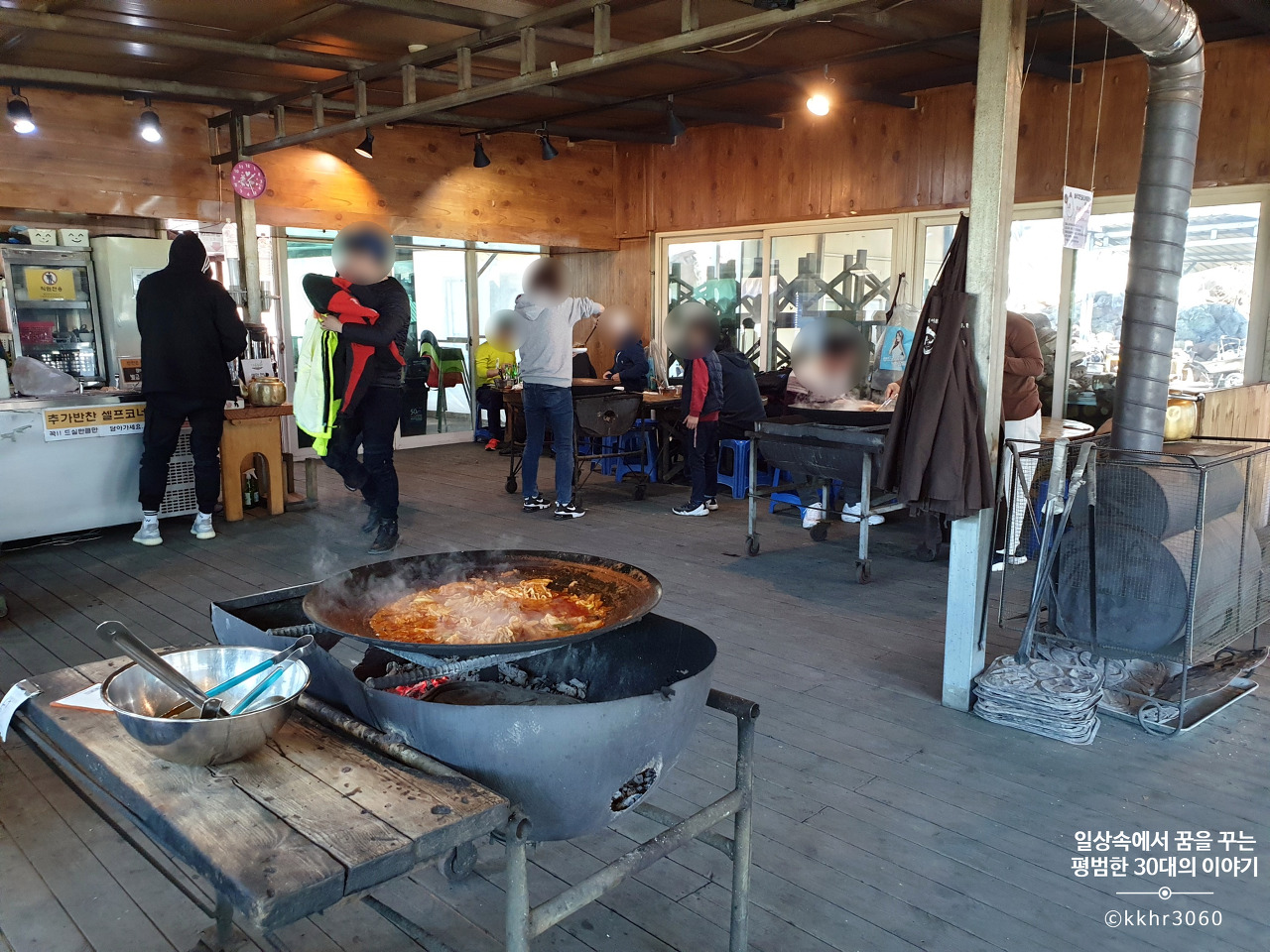 대기석이 마련되어 있는 곳에서 밖으로 나가면 테이블마다 번호표가 붙어있고 그 옆에 장작불로 여러 개의 솥뚜껑 전골을 열심히 직원분들이 끓이고 계신 것을 볼 수 있다. 겨울임에도 불구하고 장작불이 뜨겁게 느껴져서 겨울에 오길 잘했다 생각이 들었다. 봄, 여름, 가을에는 못 갈 것 같고 초겨울에나 가야 딱 좋을 듯하다.