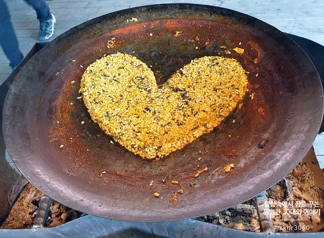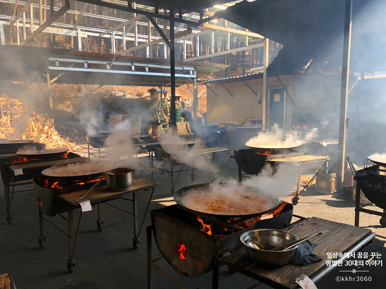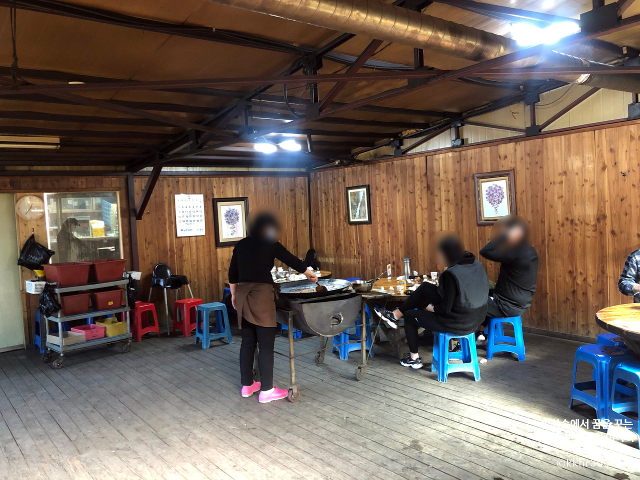 대기석이 마련되어 있는 곳에서 밖으로 나가면 테이블마다 번호표가 붙어있고 그 옆에 장작불로 여러 개의 솥뚜껑 전골을 열심히 직원분들이 끓이고 계신 것을 볼 수 있다. 겨울임에도 불구하고 장작불이 뜨겁게 느껴져서 겨울에 오길 잘했다 생각이 들었다. 봄, 여름, 가을에는 못 갈 것 같고 초겨울에나 가야 딱 좋을 듯하다.