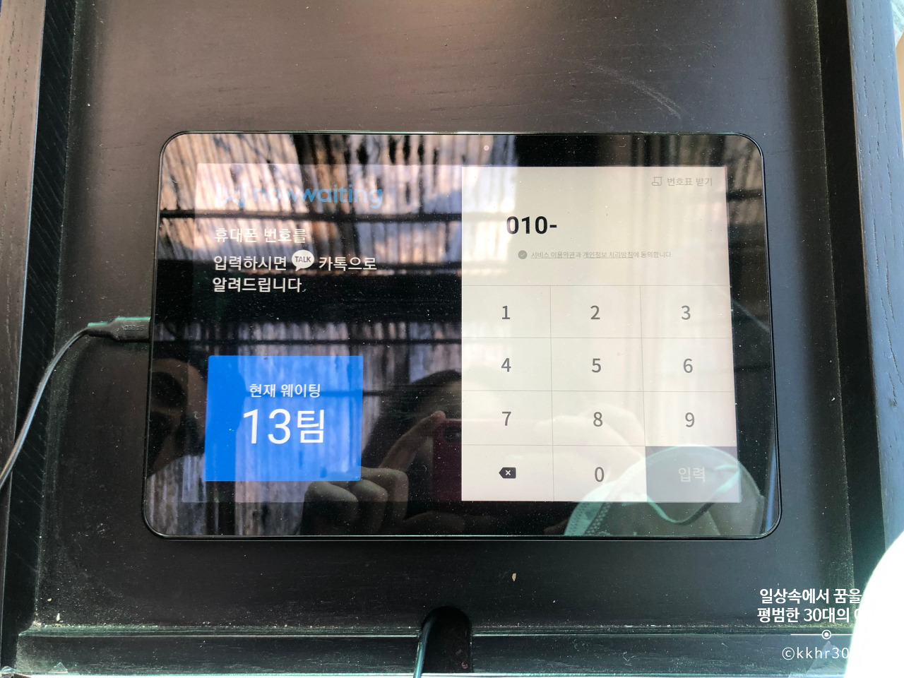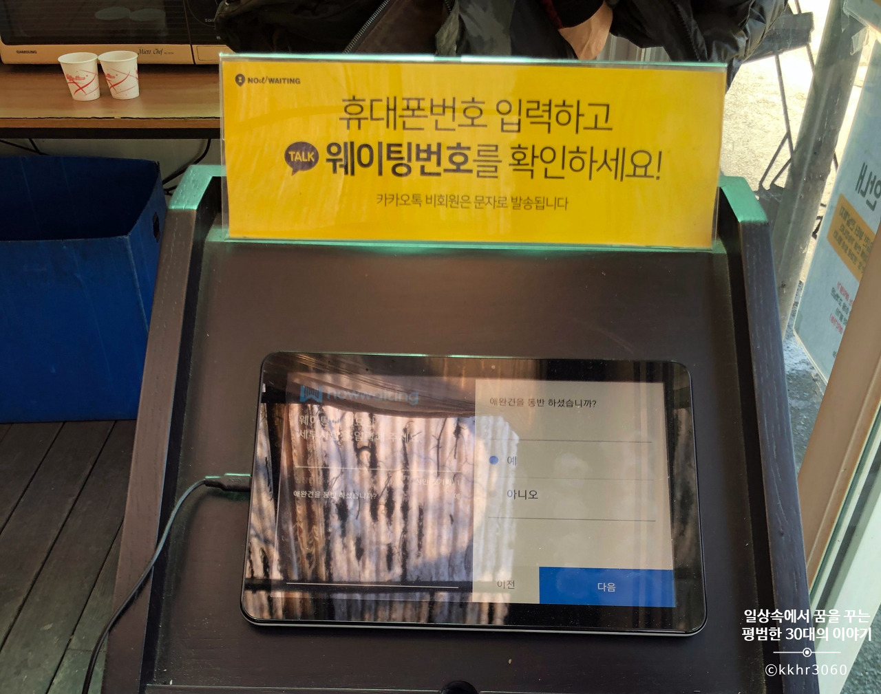 무조건 도착을 하면 번호표를 최대한 빨리 뽑기 위해 여기로 달려가야 한다. 이 문으로 들어서면 오른쪽에 키오스크 기계가 있는데 거기에 핸드폰 번호와 동반 인원수를 입력하면 앞에 몇 명의 대기팀이 현재 있는지 나의 대기번호는 몇 번인지 수시로 카카오톡으로 메시지가 온다.