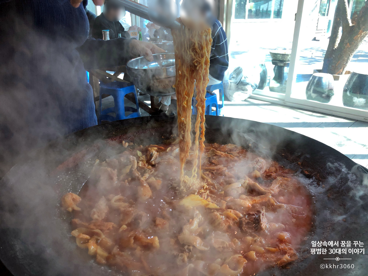 자리에 앉은지 얼마 되지 않아 직원분께서 밑반찬 5가지와 물을 자리에 가져다주신다. 만약 반찬을 더 먹고 싶다 하면 셀프 코너에서 직접 가져다가 먹으면 된다. 반찬은 그냥 특이할 것 없는 회사 근처 백반집에서 먹을법한 평범한 맛이었다. 기다리다 지쳐 우선 허겁지겁 반찬으로 배를 조금 채우고 있던 찰나, 우리의 닭볶음탕 등장!!! 아저씨가 용광로처럼 팔팔 끓고 있는 닭볶음탕을 식탁 옆에 가져다주셨다. 그때부터는 셀프로 떠서 먹으면 된다. 우리는 걸쭉한 닭볶음탕을 좋아하기 때문에 국물이 좀 더 없어질 때까지 기다렸다가 먹었다. 기다리는 동안 우리가 추가 주문한 라면, 감자수제비가 나왔는데 한 번에 다 넣고 5~10분 뒤쯤 먹으니 딱이었다.
