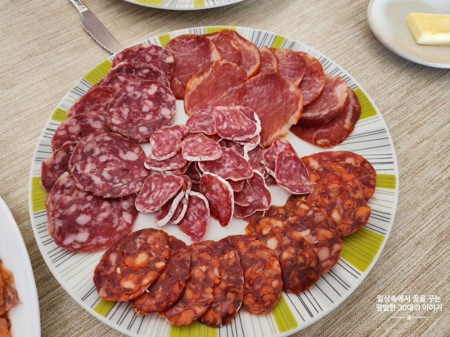 저녁: Salchichón, Lomo, Fuet, Jamón, Pan con tomate, 홍합 |
