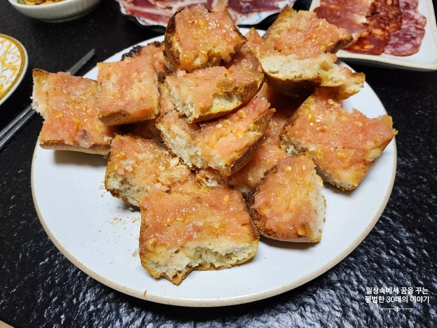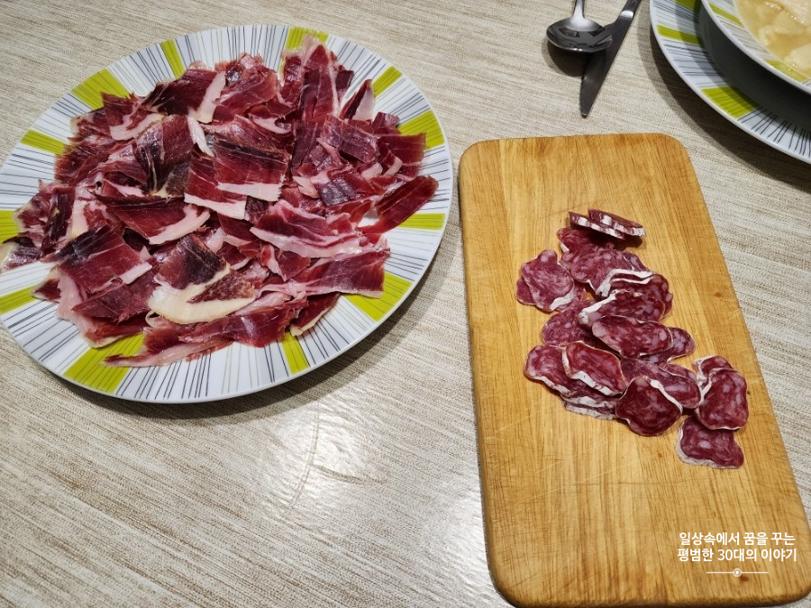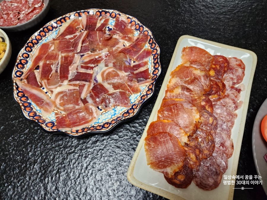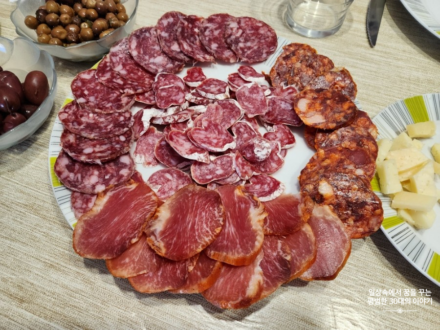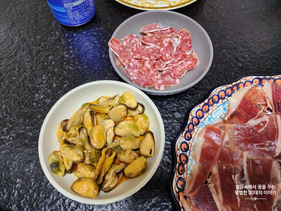 메뉴: Salchichón, Lomo, Fuet, Jamón, Pan con tomate, 홍합, 닭가슴살 샐러드