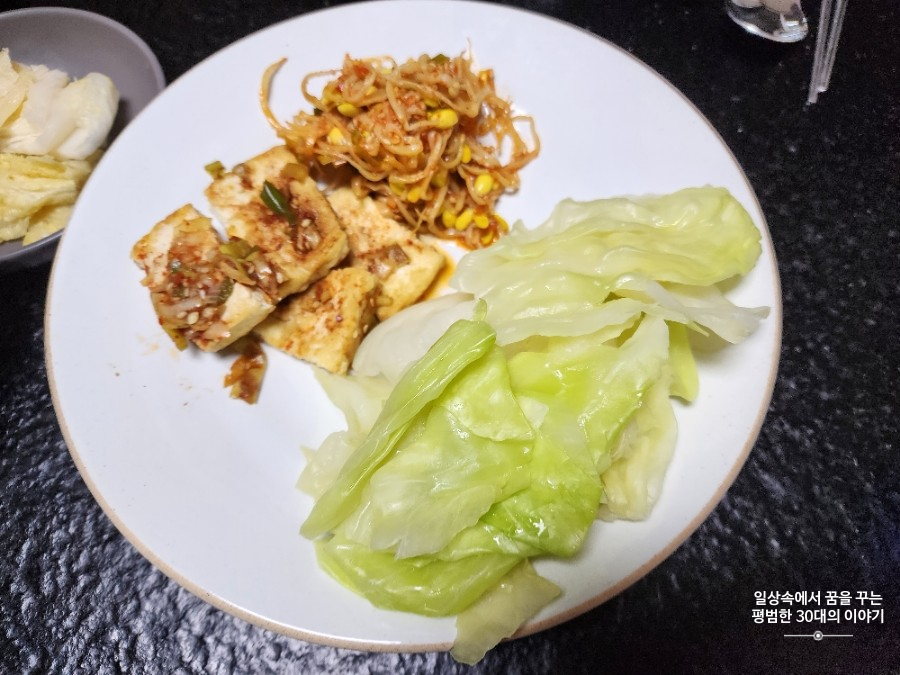 저녁: 배추 된장국, 제육볶음, 콩나물 무침, 두부, 삶은 양배추 |
