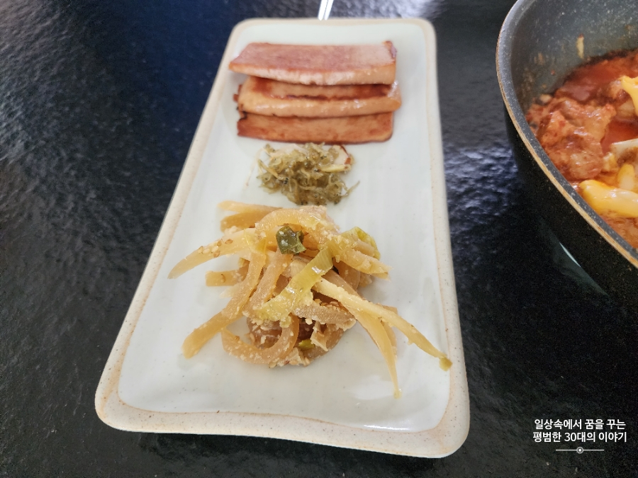 메뉴: 치즈닭갈비, 스팸, 무나물, 멸치볶음
