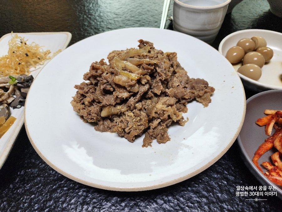 메뉴: 불고기, 미역국, 무나물, 버섯나물, 쥐포무침, 장조림, 도라지무침