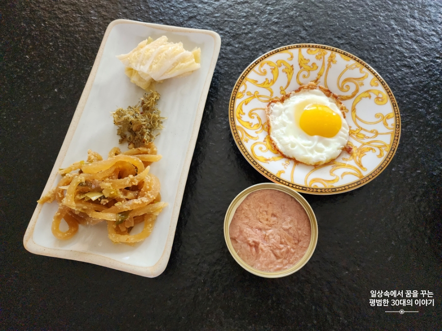 메뉴: 참치, 계란후라이, 백김치, 멸치볶음, 무나물