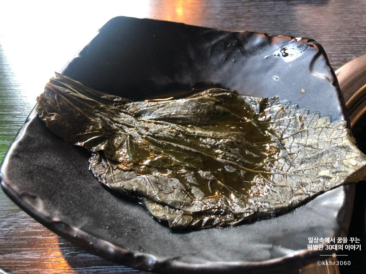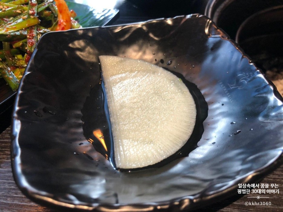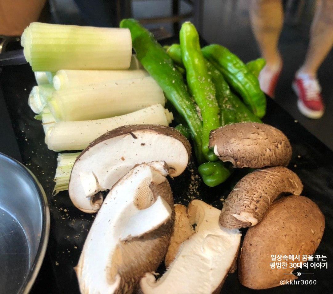 모둠 야채구이에는 대파, 꽈리고추, 표고버섯이 나오는데 대파가 그중에 가장 양이 많고 그다음으로 꽈리고추 그리고 표고버섯이 가장 양이 적다. 뭐 단가를 생각하면 그럴 수밖에 없는 건가 싶기도 하다. 어쨌든 이 세 가지 야채를 숯불에 구워 다진 마늘 장에 찍어 먹는데 담백하니 괜찮다. 대파랑 꽈리고추는 이번에 처음 이렇게 숯불에 구워 먹어봤는데 꽤 괜찮아서 다음에 집에서 고기를 구워 먹을 때, 같이 구워 먹으면 좋겠다 싶었다. (꽈리고추는 너무 매워서 많이 못 먹긴 했지만)