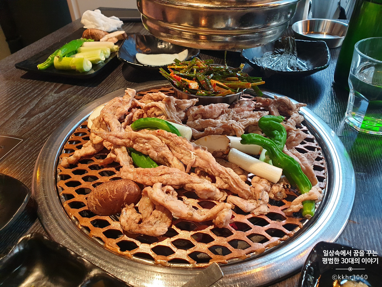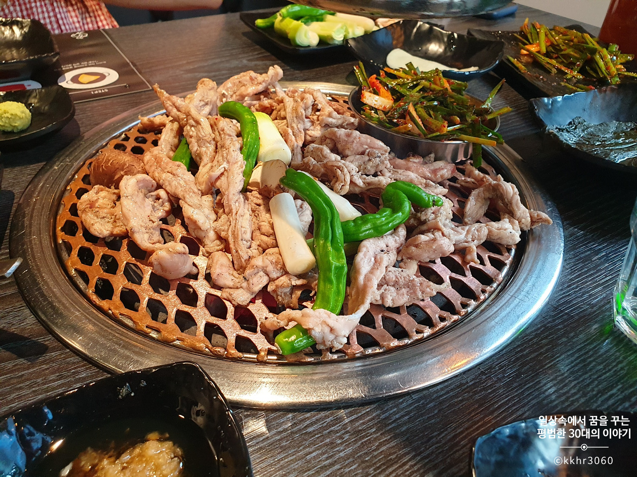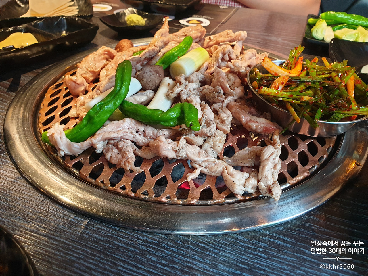 모둠 야채구이에는 대파, 꽈리고추, 표고버섯이 나오는데 대파가 그중에 가장 양이 많고 그다음으로 꽈리고추 그리고 표고버섯이 가장 양이 적다. 뭐 단가를 생각하면 그럴 수밖에 없는 건가 싶기도 하다. 어쨌든 이 세 가지 야채를 숯불에 구워 다진 마늘 장에 찍어 먹는데 담백하니 괜찮다. 대파랑 꽈리고추는 이번에 처음 이렇게 숯불에 구워 먹어봤는데 꽤 괜찮아서 다음에 집에서 고기를 구워 먹을 때, 같이 구워 먹으면 좋겠다 싶었다. (꽈리고추는 너무 매워서 많이 못 먹긴 했지만)