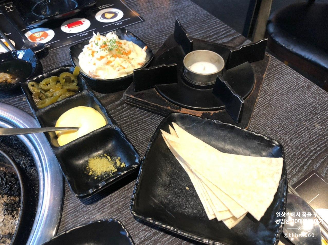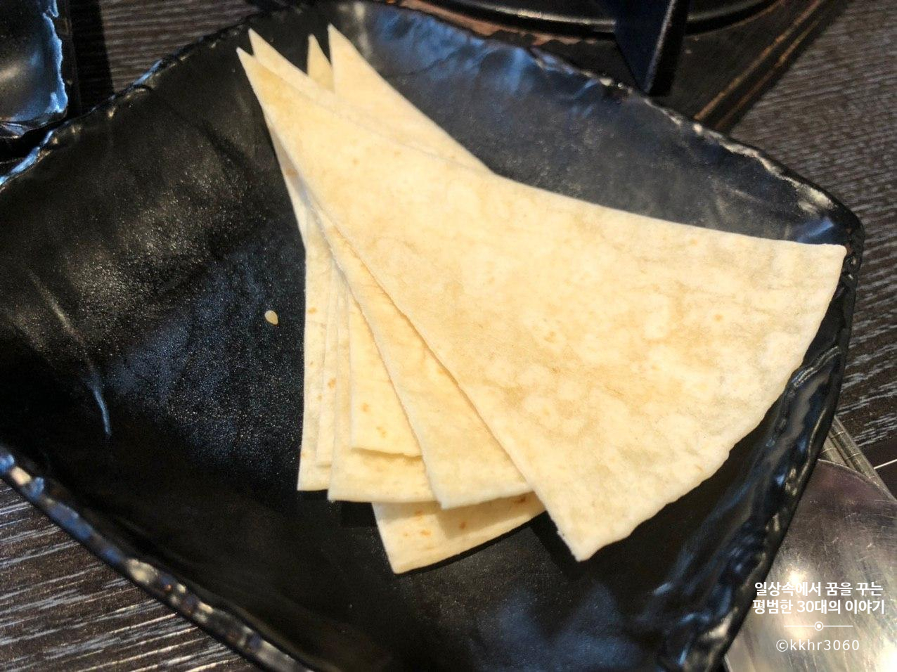 처음에 또띠아를 한 7~8장 준비해 주시는데 2인분에 7~8장은 턱없이 부족하다. 그리고 또띠아에 한 번 싸먹기 시작하면 계속 그렇게 먹고 싶어지는 사람의 마음. 그래서 결국 또띠아를 추가 주문하게 된다. 처음에는 반찬처럼 계속 더 주는 건 줄 알았는데 그건 아니었고 또띠아를 추가 주문 (2000원) 하는 거였다. 설마 2000원에 7~8장을 주는 거 아닌가 걱정했는데 넉넉한 양의 또띠아를 줬다.