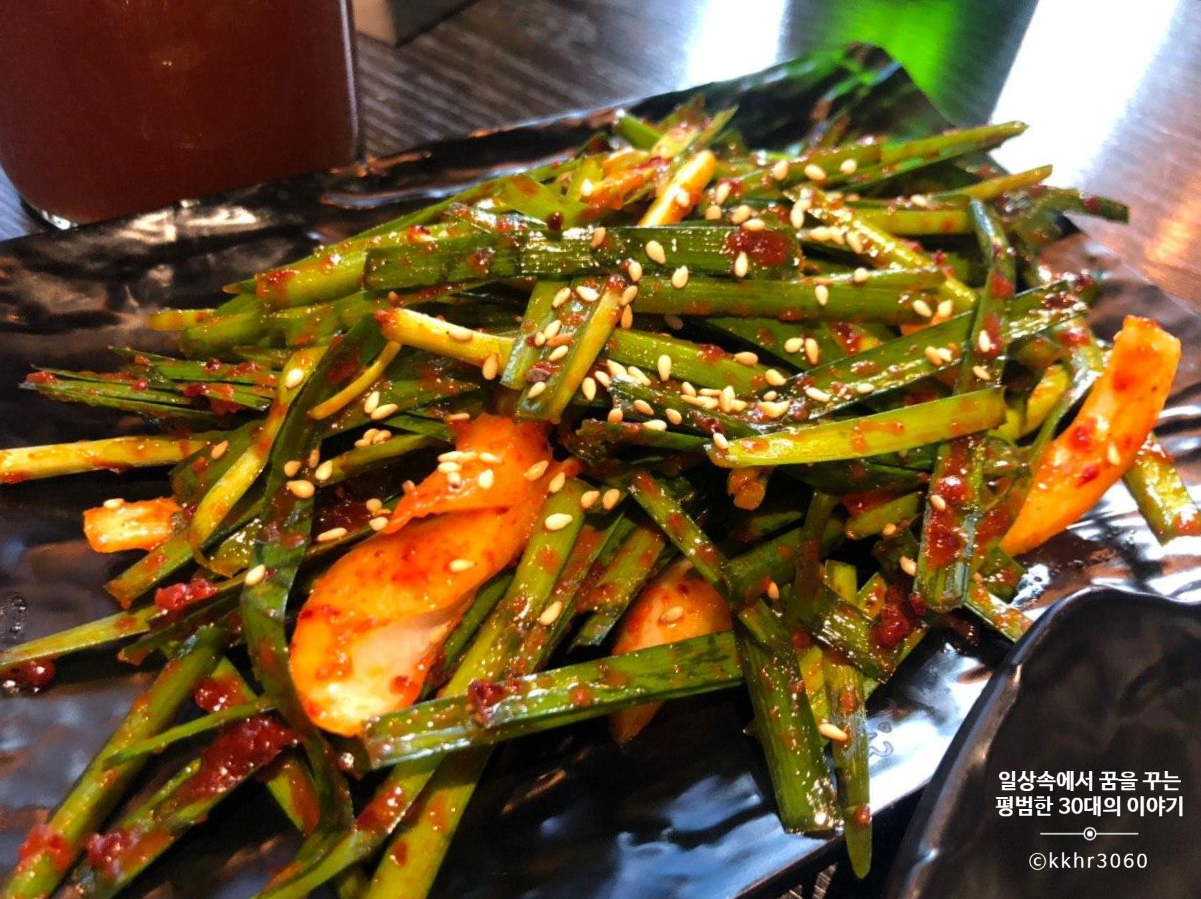 부추는 불판에 구워주는데 굽지 않은 부추도 맛이 있다. 내가 먹어보니 다른 건 몰라도 또띠아에 닭 목살구이를 싸먹을 때, 부추겉절이는 무조건 넣어야 할 듯! 물론 이건 개인적인 취향인데 부추겉절이를 넣었을 때가 가장 맛있다. 나머지 소스나 재료는 넣어도 그만 안 넣어도 그만인데 (치즈 퐁듀 소스는 찍어 먹기를 추천) 부추겉절이는 넣었을 때와 안 넣었을 때 차이가 크더라.