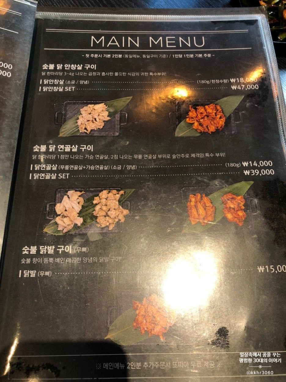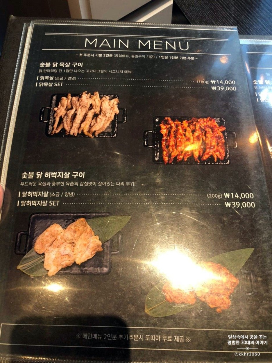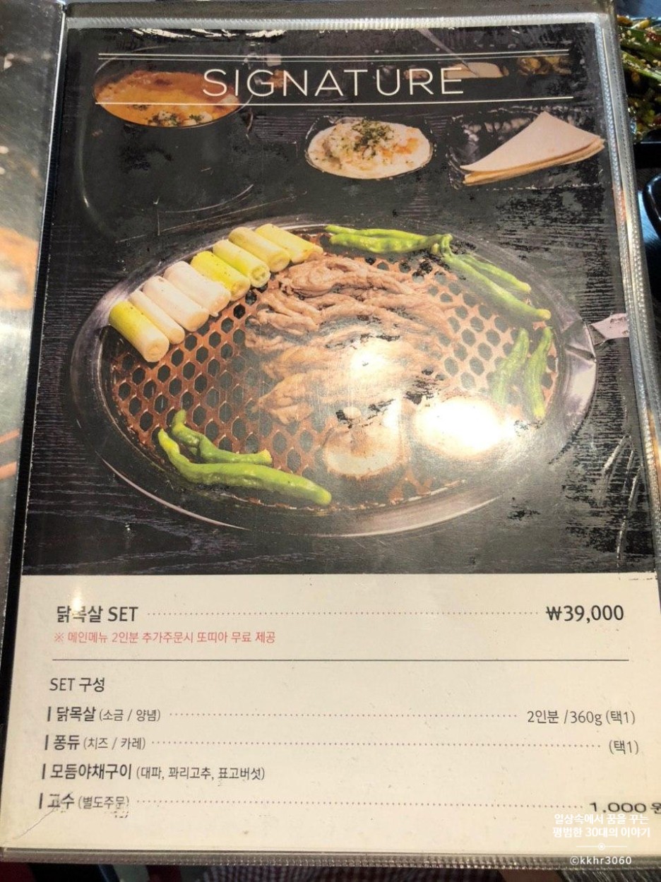 처음 방문한 거기 때문에 메뉴는 이 집 시그니처인 닭 목살을 주문했다. 메뉴판 첫 페이지에 닭 목살 2인 세트 (39000원)가 있길래 고민 없이 그걸로 주문했다. 닭 목살 2인 세트에는 닭 목살 2인분 (360g), 퐁듀 (치즈, 카레 중 선택 가능), 모둠 야채구이 (대파, 꽈리고추, 표고버섯)이 포함되어 있는데 단품으로 시켰을 때보다 세트가 2000원 더 저렴하다. 우리는 퐁듀는 치즈로 선택!! 그리고 고수가 없으면 아쉬울 것 같아 고수를 추가 (1000원) 했다.