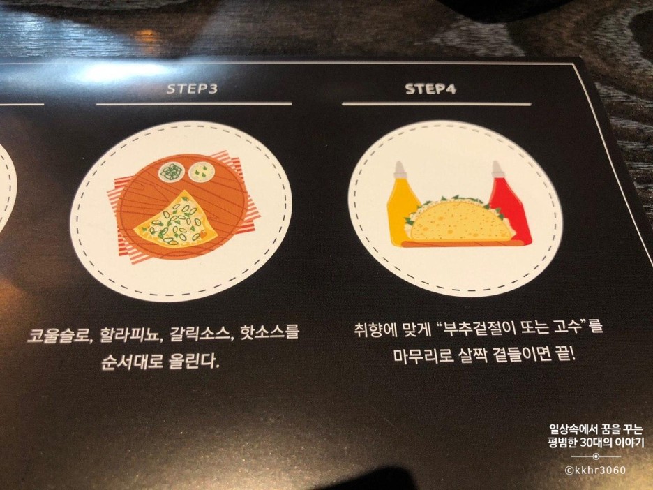 물론 코우슬로, 할라피뇨, 갈릭소스, 핫 소스, 고수 등 다른 것들도 또띠아에 싸먹을 때 넣으면 좋지만 사실 설명해 준 대로 다 넣어서 먹으면 닭 목살 본연의 맛을 느끼기엔 어렵다. 그래서 나는 그중에 한두 가지 정도만 같이 먹는 게 더 좋더라. (닭 목살 자체가 다른 부위에 비해 고기 자체가 두껍거나 큰 게 아니기 때문에)
