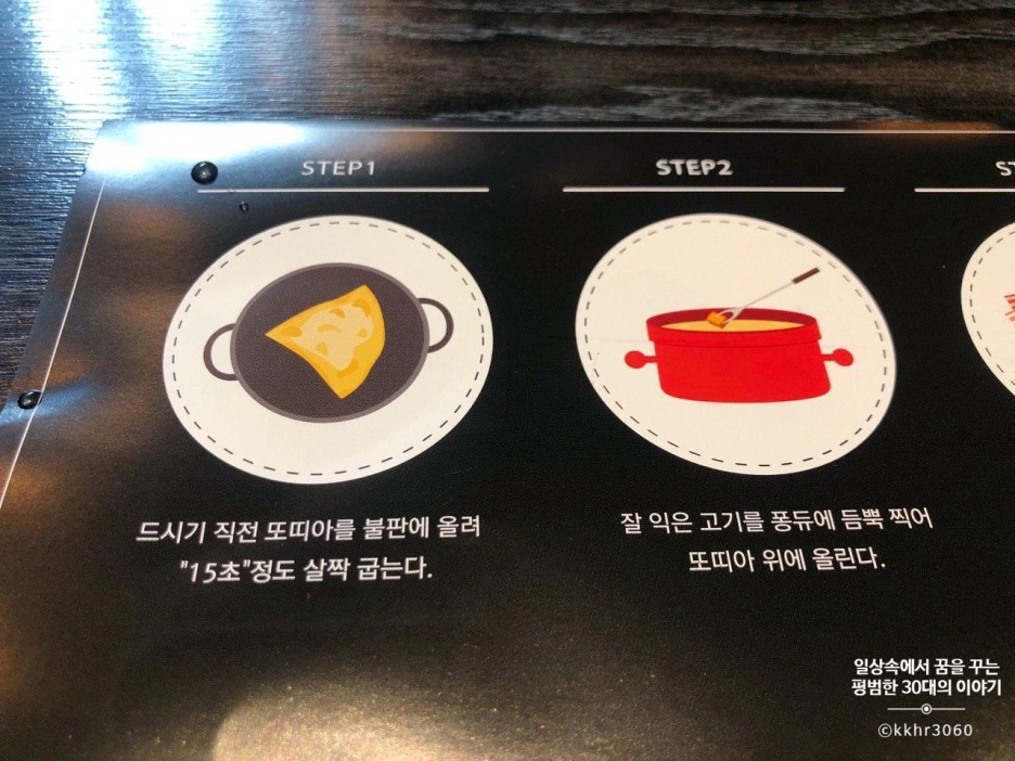 좌석마다 어떻게 먹으면 되는지 방법이 친절하게 이미지로 설명이 되어 있다. 그런데 이 이미지가 아니더라도 직원분께서 닭 목살이 어느 정도 익었을 때, 어떻게 먹으면 되는지 친절히 설명을 해주시기 때문에 걱정할 필요가 없다.