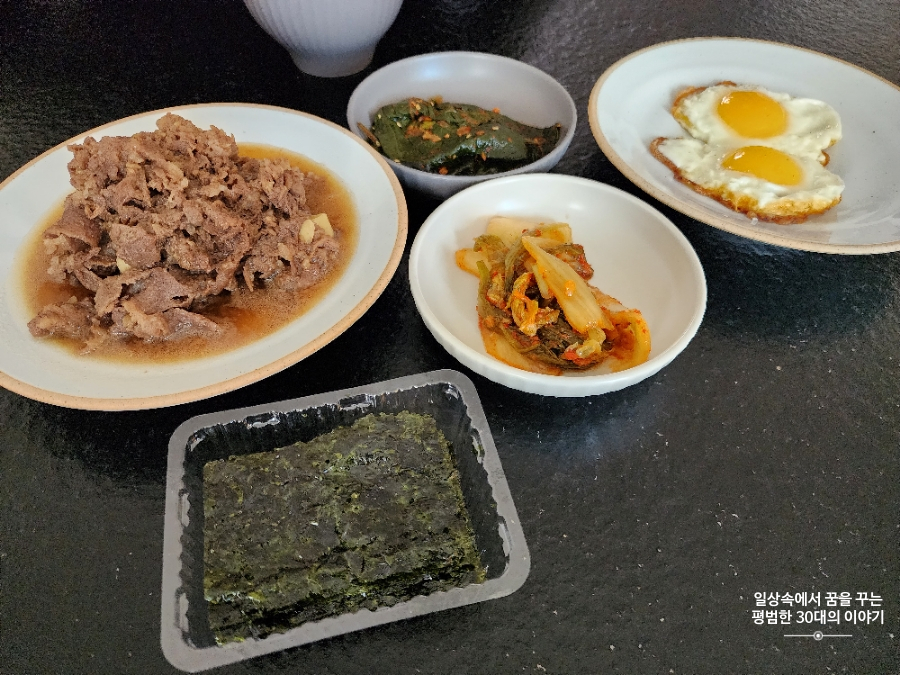 메뉴: 불고기, 계란후라이, 깻잎장아찌, 김치, 조미김