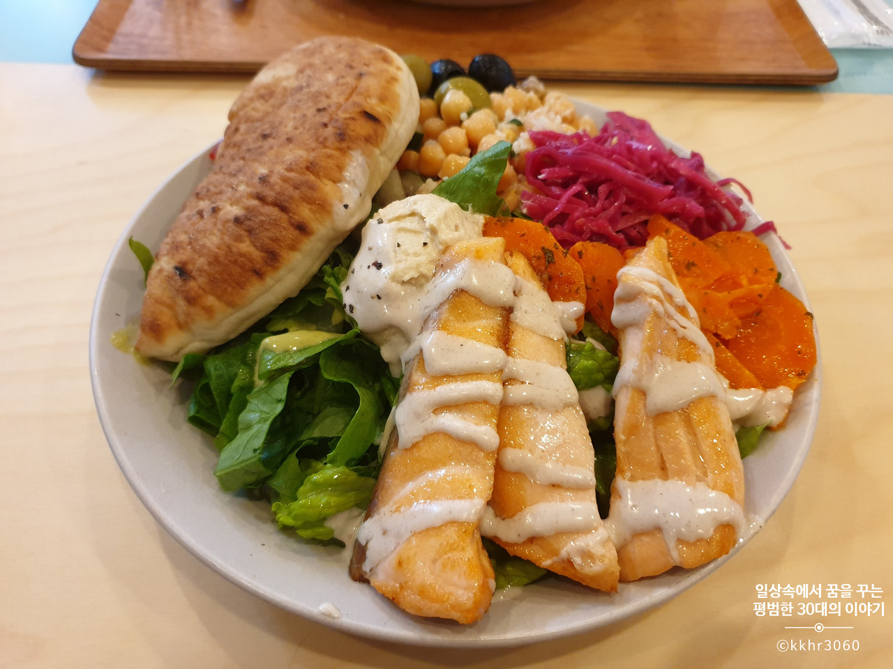 시간이 얼마 지나지 않아 진동벨이 세차게 울리고 배가 고팠던 나는 거의 뛰쳐가다시피 해서 쟁반에 우리가 주문한 두 가지의 샐러드를 자리로 가지고 왔다.