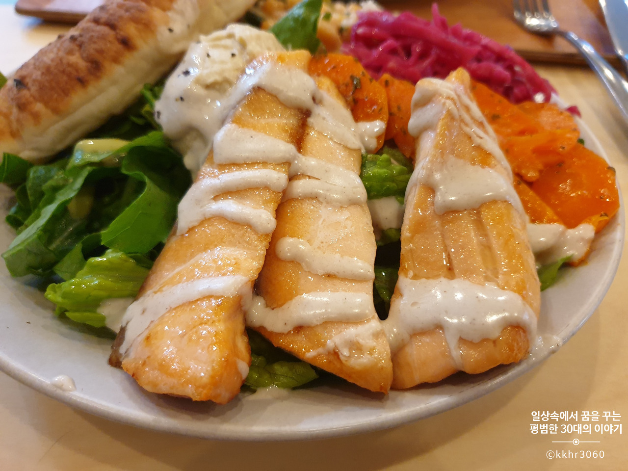 치킨 샐러드와 연어 스테이크 샐러드 모두 맛이 있었는데 굳이 둘 중에 하나를 고르자면 둘 다 치킨 샐러드에 한 표씩! 나는 샐러드와 함께 나오는 닭고기들은 대부분 퍽퍽하다는 선입견을 가지고 있었는데 여기 치킨 샐러드가 그런 선입견을 깨주었다. 닭고기가 훈제 향이 살짝 나면서 엄청 부드럽고 촉촉했다. 연어도 물론 부드럽고 담백하게 잘 구워져서 맛이 있었지만 이건 개인의 취향이니까.