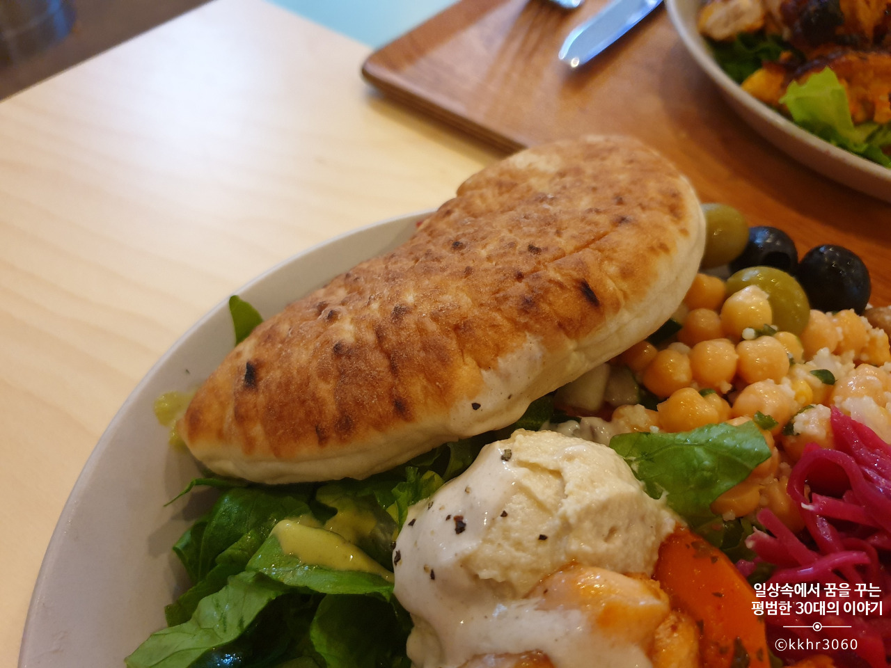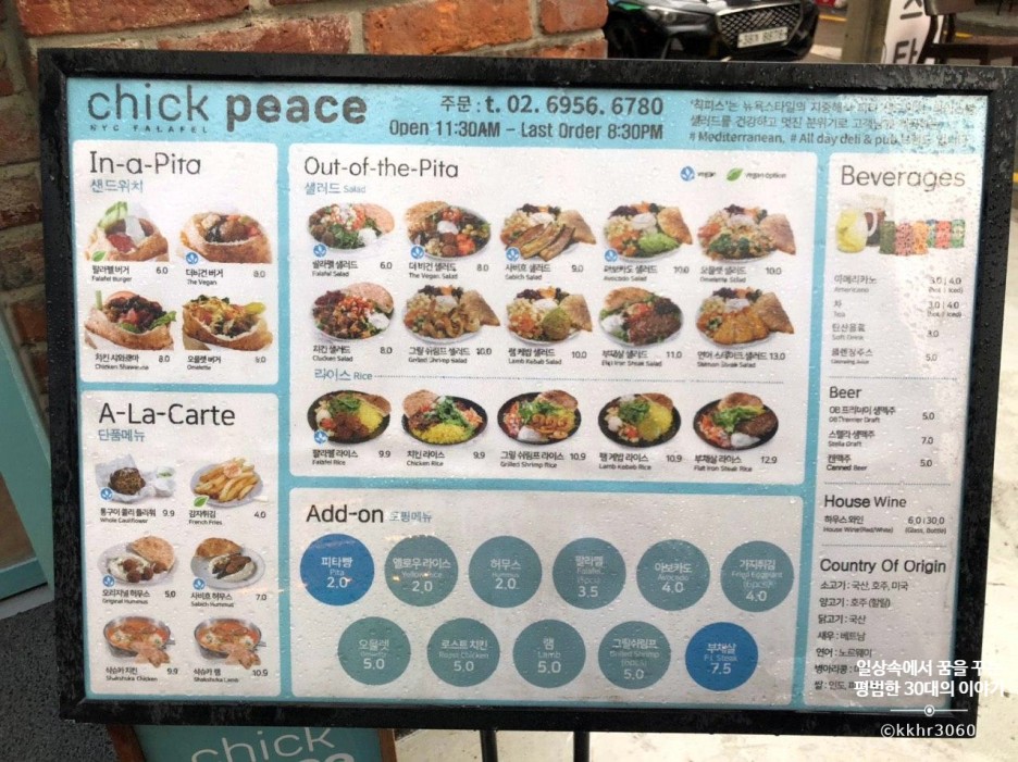 나는 팔라펠을 그다지 좋아하는 편은 아니라 팔라펠이 들어있지 않은 메뉴 중 치킨 샐러드 (8000원)과 연어 스테이크 샐러드 (13000원)을 주문했다. 맛있어 보이는 메뉴들이 너무 많아서 고르는 데 좀 시간이 걸렸다.