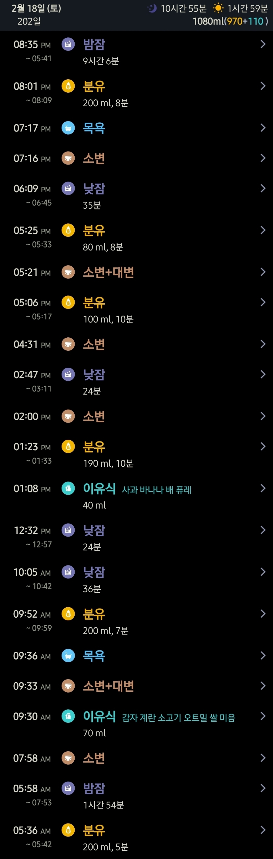 아직도 이유식의 양이 늘지 않아 하루에 2번 주기는 무리인 것 같다. 주변에 이안이 또래를 보면 우선 양을 늘리고 한 번에 먹는 양이 최소 100은 넘어야 하루에 2번씩 주기 시작하는 것 같다. 이러다가 먹는 양이 확 많아질 수도 있다고 하니 조급하게 마음먹지 않으려 한다. 중간에 간식을 꾸준히 주고 있기 때문에 나중에 하루에 2번씩 주게 될 때 간식 주던 시간에 이유식을 주면 될 것 같다. 이번 주에 이안이는 엎으려 있을 때 좀 더 팔을 쭉 펴서 하늘 보기 자세를 완벽하게 할 수 있게 되었다. 그리고 점점 몸을 회전하는 각도가 늘어나고 있고 허리를 펴고 앉는 시간이 늘어나고 있다. 터미타임을 좀 더 자주 해줘야 할 것 같다. 이 앓이를 하지는 않지만 여전히 침은 폭포수처럼 떨어지고 게워내는 것도 여전하다. 덕분에 매일 세탁기가 바쁘게 돌아가고 있다. 낮잠 자는 텀을 늘리면 낮잠을 조금 더 길게 자지 않을까 싶어서 1시간 반마다 자던 낮잠을 2시간을 늘려도 보았지만 큰 효과는 없었다.