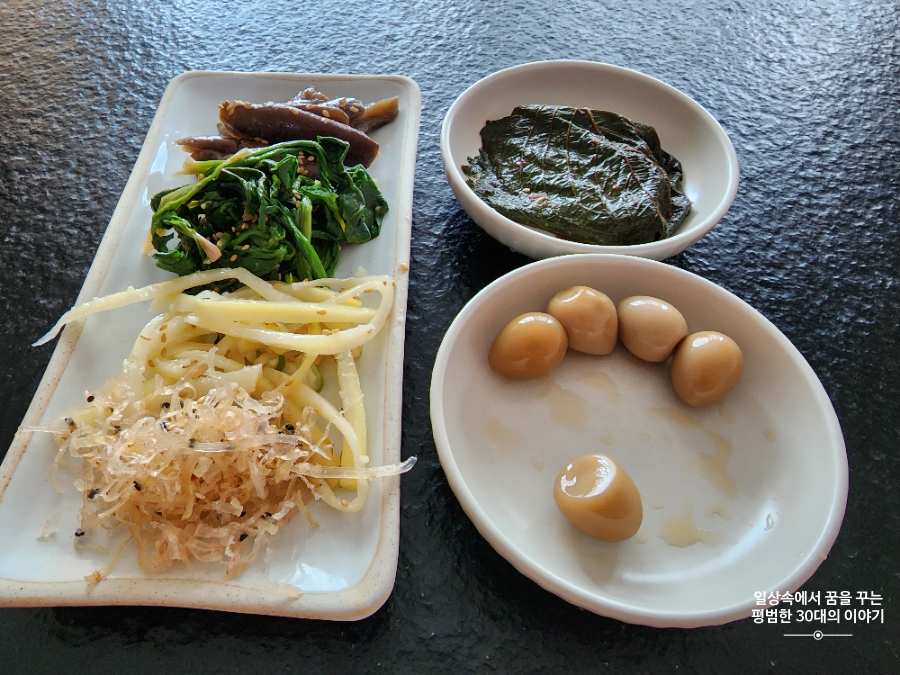 메뉴: 메추리알, 깻잎장아찌, 시금치나물, 도라지나물, 가지나물, 쥐포 볶음