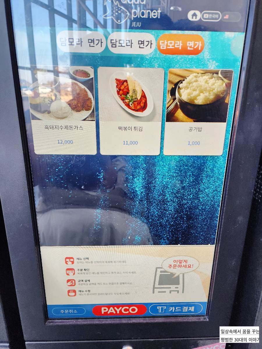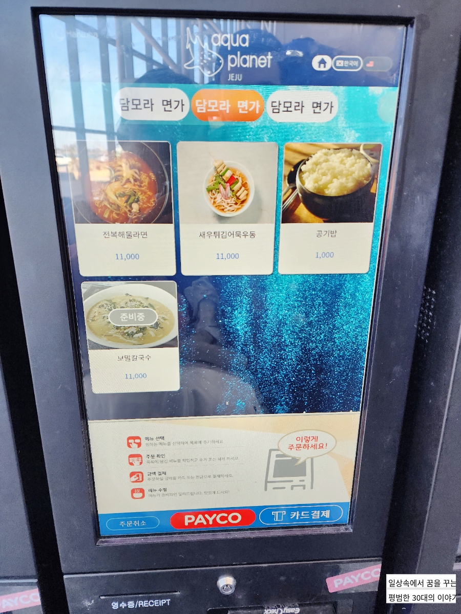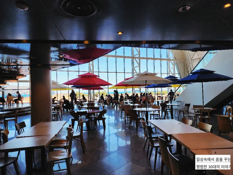 아기와 함께 갈만한 곳을 찾다가 가게 된 아쿠아플라넷 제주! 제주도에 수도 없이 갔지만 아쿠아플라넷 제주를 가본 건 이번이 처음이다. 이전에 제2 롯데월드에 있는 아쿠아리움과 단양 다누리 아쿠아리움에 남편과 함께 가본 적은 있다. 어쨌든 기상상황이 워낙 오락가락 한 제주도이기 때문에 그런 날 아기와 함께 가기에 안성맞춤인 곳이 아쿠아플라넷 제주인 것 같다. 생각보다 둘러보는 게 시간이 꽤 걸린다는 후기를 읽고 점심을 근처에서 먹으려다 아기와 함께 하는 여행이기에 동선을 줄일 겸 아쿠아플라넷에서 점심을 먹기로 했다. 아쿠아플라넷 제주에는 푸드코트가 있는데 선택지가 많지는 않지만 푸드코드에서 볼 수 있는 풍경이 너무 좋기 때문에 풍경이 한몫하는 것 같다.