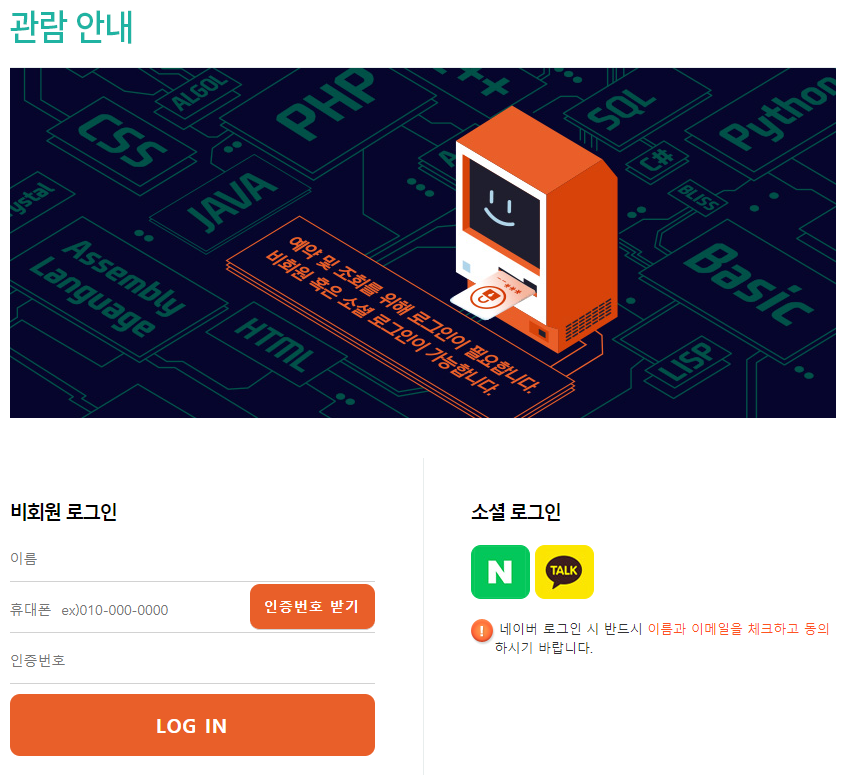 7) 비회원 로그인하거나 네이버, 카카오 아이디로 로그인한다. 나는 소셜 로그인을 선호하지 않기 때문에 비회원 로그인 선택! 이름, 휴대번호 기재하고 인증번호 받기 클릭하면 인증번호가 문자로 오는데 그 인증번호를 기재하면 된다. 그러고 나서 로그인 클릭!