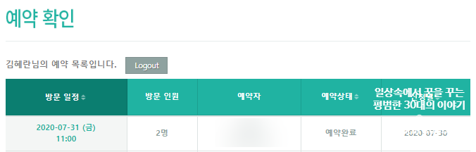 5) 방문 인원수를 기재한 후, 예약 가능 확인을 클릭! 그리고 예약하기를 클릭! (최대 예약 가능 인원은 9명이고 10명 이상은 전화 혹은 메일로 문의해야 한다.)