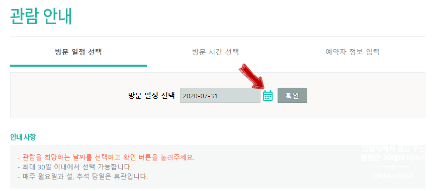 4) 방문하고자 하는 시간을 선택한다. (관람객이 붐비지 않는 시간대를 선택하고 싶다면, 각 시간대별 예약 가능 인원이 나와있으므로 참고하면 좋다.)