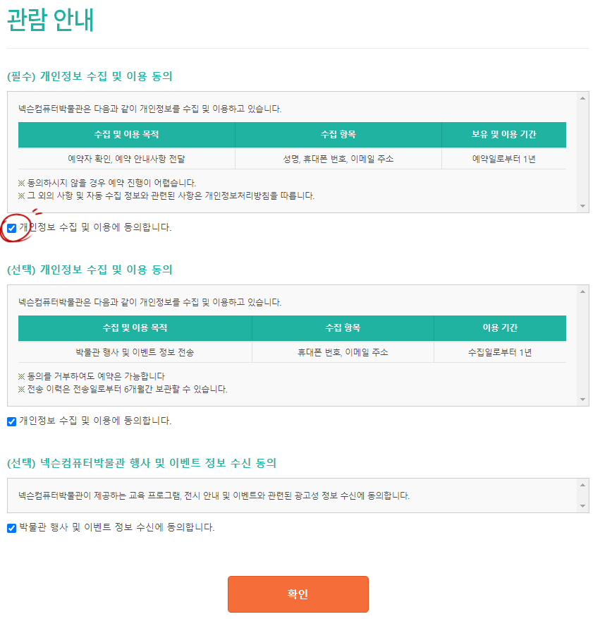 6) 필수 내역만 체크하고 선택란은 체크 안 해도 된다. 개인 정보 수집 및 이용 동의에 체크를 완료했다면 맨 하단에 확인 클릭!
