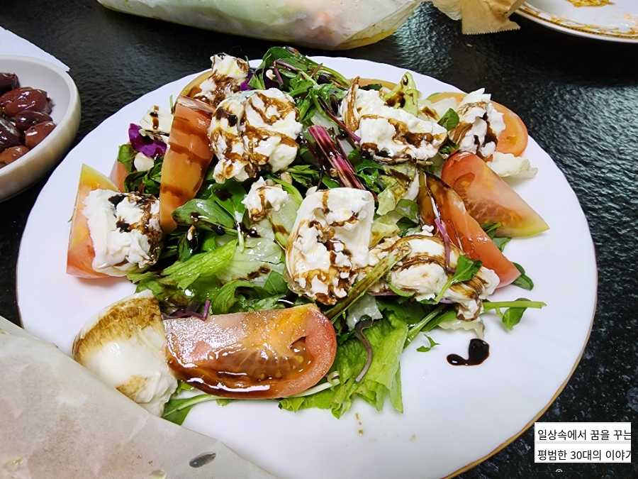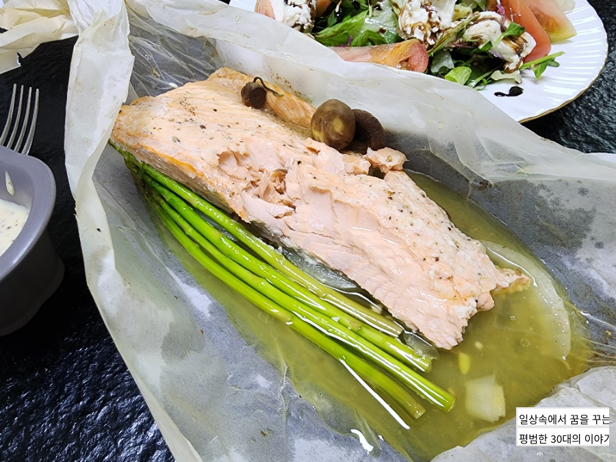 메뉴: 연어파피요트, 부라타치즈 샐러드, 올리브
