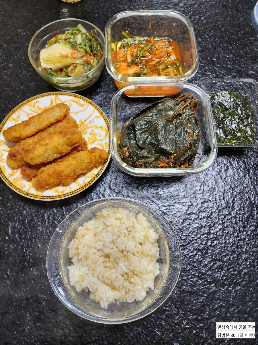 점심: 깻잎장아찌, 조미김, 오이부추무침, 물김치, 돈까스