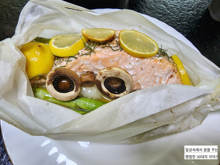메뉴: 연어파피요트, 리코타치즈 샐러드, 당근케이크