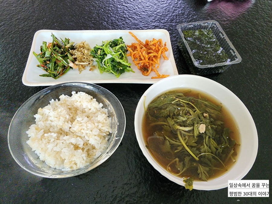 메뉴: 쑥된장국, 취나물, 진미채볶음, 부추무침, 멸치볶음, 조미김