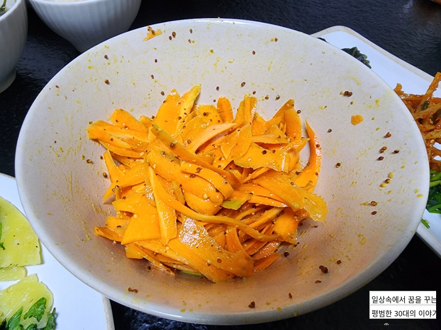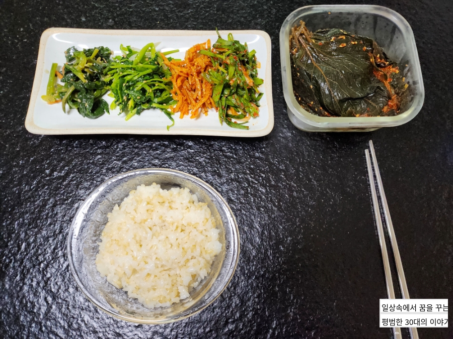 점심: 시금치나물, 취나물, 부추무침, 진미채볶음, 깻잎장아찌