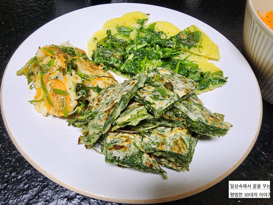 저녁: 쑥된장국, 야채전, 쑥전, 미나리전, 당근라페, 취나물, 진미채볶음, 깻잎장아찌 |