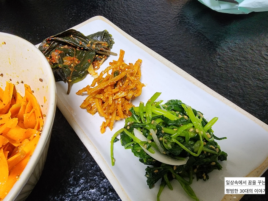 메뉴: 시금치나물, 취나물, 부추무침, 진미채볶음, 깻잎장아찌