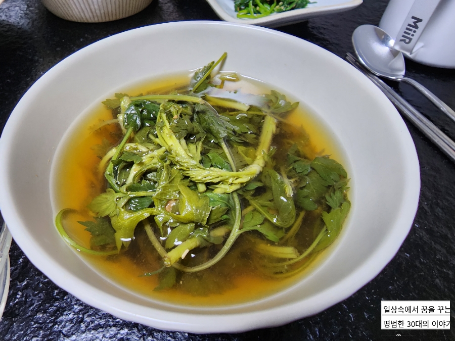 메뉴: 쑥된장국, 야채전, 쑥전, 미나리전, 당근라페, 취나물, 진미채볶음, 깻잎장아찌