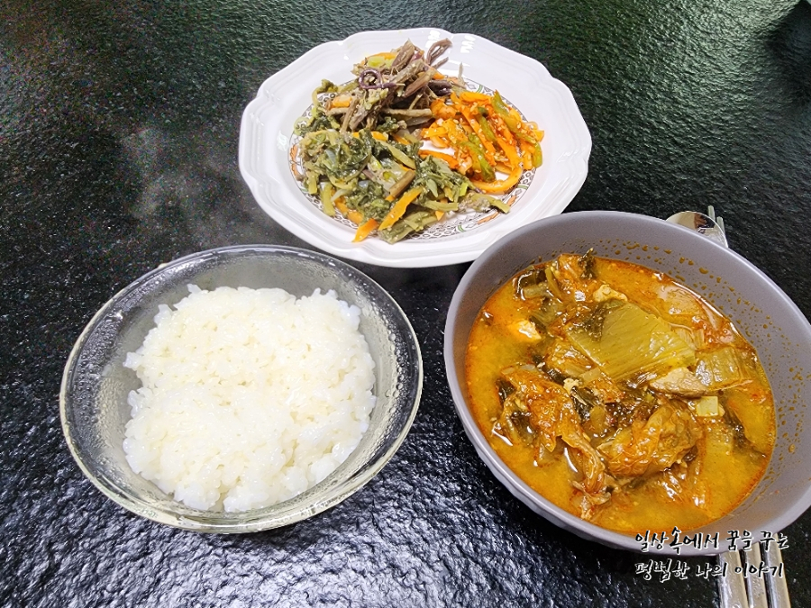 점심: 김치찌개, 고사리나물, 도라지무침, 시래기나물