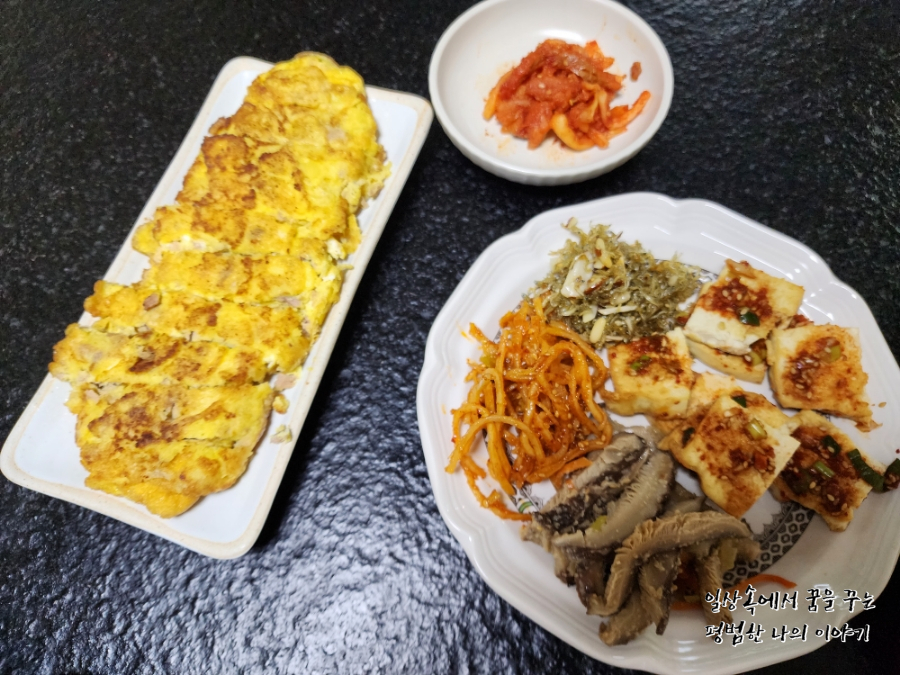 저녁: 가자미구이, 고등어구이, 참치 계란말이, 명태 무침, 두부구이, 버섯나물, 진미채볶음, 멸치볶음 |