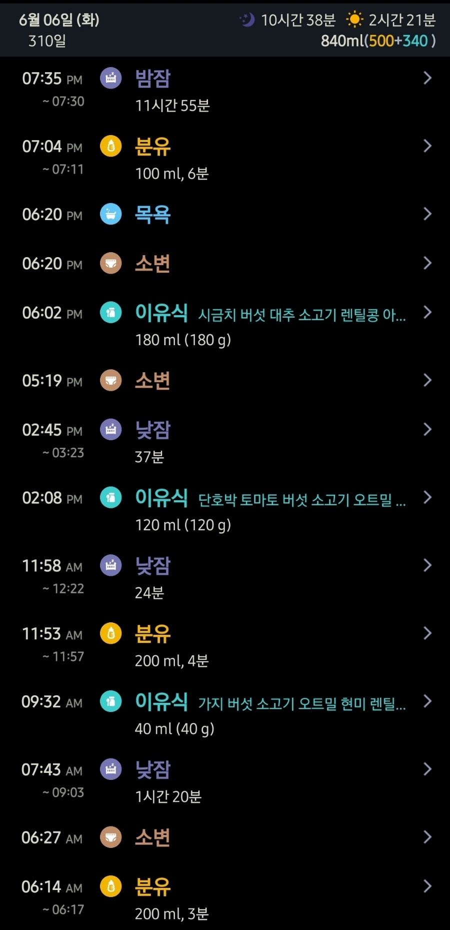 이유식 횟수: 하루 3회 180g씩 총 540g