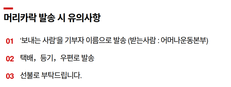 나 같은 경우, 우선 회원가입을 하고 미용실에서 머리를 자른 후, 어머나운동본부에 모발을 보낸 후, 기부 신청서를 제출하였다.(기부 신청서를 작성할 때 운송장 번호가 꼭 필요하다)