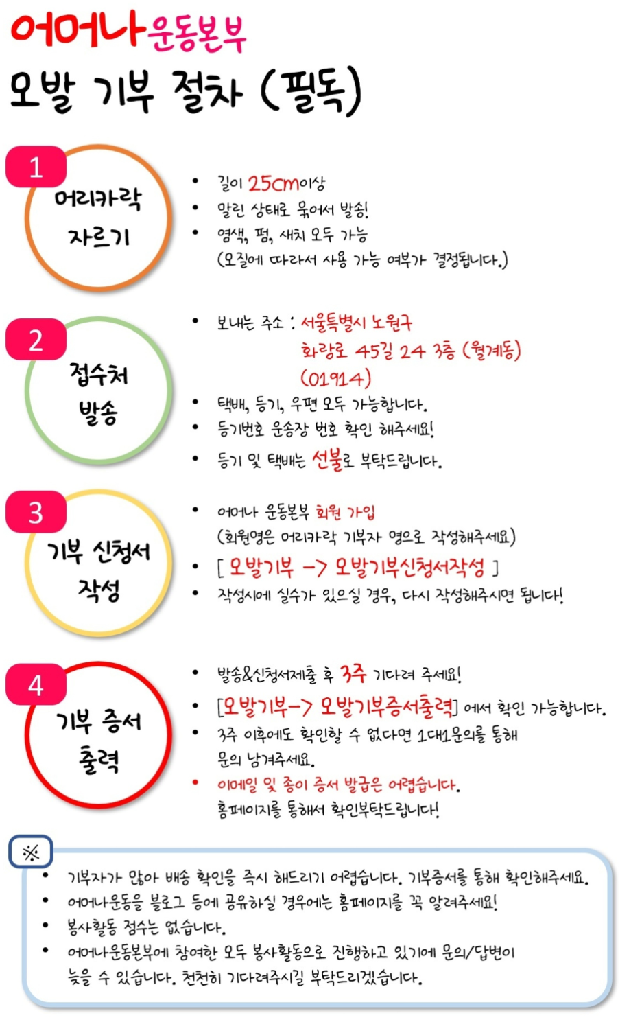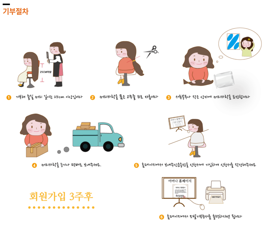 모발 기부 절차는 어머나운동본부에서 내용을 가져와 아래에 기재해 두었으니 참고하여 진행하면 될 것 같다.