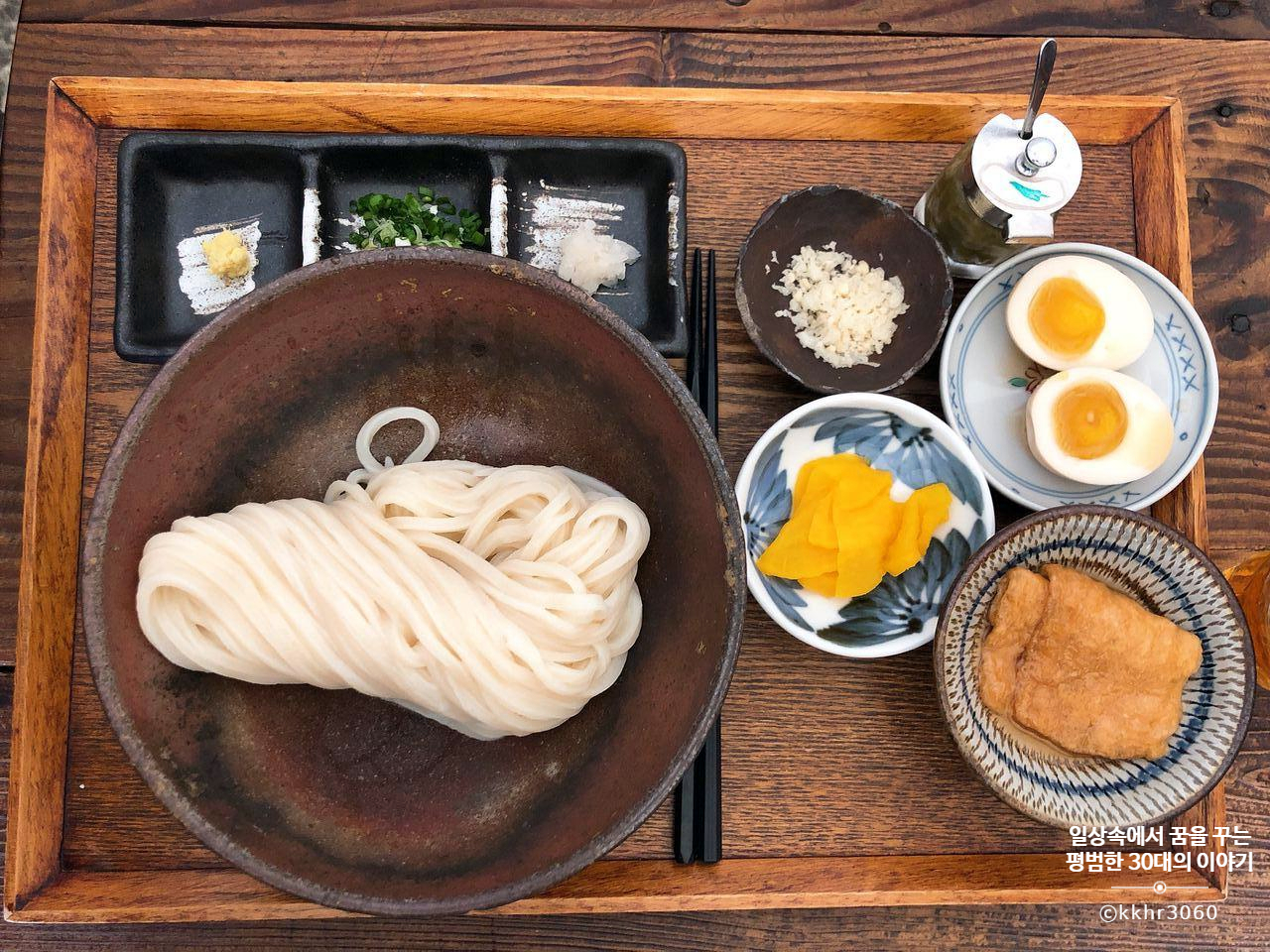 시간이 한참 흐른 뒤, 무 즙, 쪽파, 고추냉이, 전남 고흥 유자를 착즙한 즙, 다진 매운 고추, 단무지, 탱글탱글해 보이는 우동면, 추가로 주문한 반숙 달걀 아지다마고와 기쯔네 유부 조림이 식탁 위에 차려졌다. 보자마자 신나는 마음으로 유자즙, 무 즙, 쪽파, 고추냉이 그리고 특제 간장을 우동면 위에 다 쏟아 넣고 쓱쓱 비벼 한 입 먹으니 멈출 수가 없다. 나온 지 한 10분도 안 돼서 다 먹은 것 같다. 식당 입구에 적혀있는 안내문을 보니 되도록 일행과 대화를 삼가해달라고 쓰여있었던 것 같던데 그런 문구가 필요가 없을 정도로 말 한마디 없이 고개를 푹 쑥인 채 우동면 먹기에 바빴다.