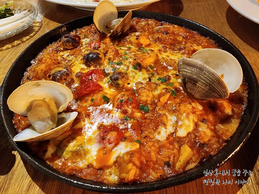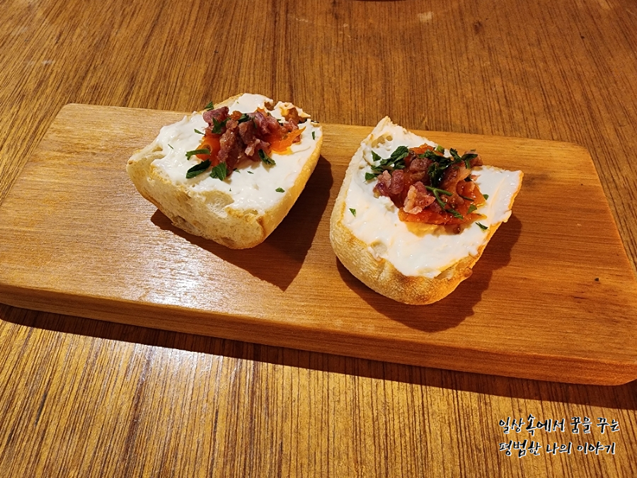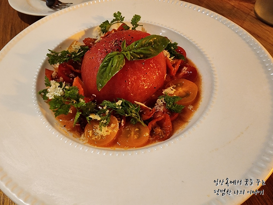 우리는 둘이서 가스파초 부라타치즈(17000원), 들깨 크림 뇨끼(22000원) 그리고 토마토 해산물 빠에야(22000원)을 주문했다. 제일 먼저 식전 빵이 준비되고 가스파초 부라타치즈, 들깨 크림 뇨끼 그리고 토마토 해산물 빠에야 순으로 서빙되었다. 개인적으로는 들깨 크림 뇨끼가 제일 인상적이었다. 물론 내가 먹어본 뇨끼 중에 단연코 1등은 제주도에 있는 환이네 이태리 식당이지만 여기도 맛이 꽤 괜찮았다. 꾸덕꾸덕한 소스에 포슬포슬한 감자의 식감이 잘 어우러져서 맛이 있었고 무엇보다 음식이 모두 자극적이지 않고 자연 그대로의 맛을 살린 것 같아 좋았다. 가스파초 부라타치즈는 내가 예상했던 맛이었는데 신맛을 별로 안 좋아하는 내게는 상큼함이 조금 과하게 느껴졌다. 그리고 가장 기대했던 토마토 해산물 빠에야...! 남편이 스페인 사람이다 보니 다양한 빠에야를 한국에서 먹어봤는데 제대로 된 빠에야를 하는 곳을 찾기가 무척 어렵기 때문에 빠에야를 판다고 하면 혹시나 하는 마음에 무조건 주문해서 먹어보는 편이다. 대부분은 요리사의 개인적인 해석대로 빠에야를 요리하기 때문에 전통 스페인식 빠에야를 맛보기란 쉽지 않다. 역시 이곳도 다른데 와 마찬가지로 토마토 파스타에 면 대신 밥을 넣은 것 같은 맛이었다. 토마토 맛이 너무 강하게 나는 탓에 해산물의 맛을 제대로 느끼기가 어려웠다. 그런데 이건 내가 조금 과하게 평할 수 있는 게 남편이 스페인 사람이다 보니 시부모님을 뵈러 스페인에 가면 종종 먹는 게 빠에야기 때문이다.(스페인에서는 가족 식사를 할 때 빠에야를 자주 먹는 편이다. 사실 빠에야 보다 피데와라고 밥 대신 면을 넣은 요리를 더 자주 먹는다.) 그러니 스페인과 연관이 없는 일반적인 한국 사람 입맛에는 맛있을지도 모르겠다.(모든 것은 상대적인 것이고 특히 나는 한국에서 파는 스페인 음식에 대한 평이 관대하지 않다.) 전반적인 분위기와 서비스는 좋았으나 음식은 살짝 아쉬움이 남는 곳이었다.