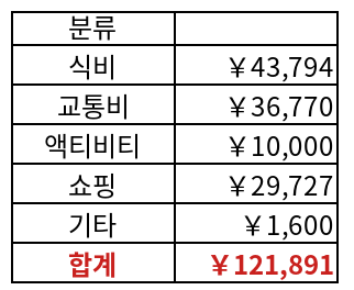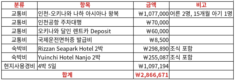 여행 경비: 총 \2,866,671원(성인 2 명,15개월 아기 1명)
