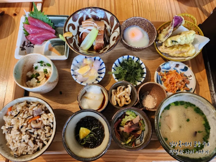 우리는 오키나와 정식 2개(각 JPY 1800)에 수란 2개를 추가하고 아이를 위해 가라아게 를 주문했다. 오키나와에 왔으니 오키나와 정식은 꼭 한번 먹어보고 싶다 생각했는데 때마침 Kaihomaru에 있길래 냉큼 주문했다. 오키나와 정식은 이곳 사람들이 일반적으로 먹는 식자재로 만든 반찬으로 구성되어 있는데 자색고구마튀김(일반적인 고구마랑 크게 맛이 다르지 않음), 두부, 여주 샐러드(?), 모즈쿠 초절임(식감이 냉면이랑 비슷하고 호텔 조식에도 항상 있음), 오키나와식 영양밥(나의 최애 메뉴), 미소 된장국, 참치 회, 바다 포도(입안에서 팍팍 터지는데 특별한 맛은 없고 짭짤함, 생긴 거에 비해 먹을만함) 그리고 돼지고기조림 등이 있다. 조금씩 작은 찬기에 담긴 모양새가 앙증맞고 정갈하다. 대부분 먹을만했고 다양한 식자재로 만든 현지 음식을 맛볼 수 있어서 좋았다. 추가로 주문한 수란은 차가워서 아쉬웠다. 아이랑 정신없이 먹다 보니 가라아게 사진은 못 찍었는데 속은 부드럽고 겉은 바삭해서 맛있게 먹었다. 가격대가 비싼 편이지만 다양한 음식을 맛볼 수 있으니 한 번쯤은 먹을만한 것 같다.