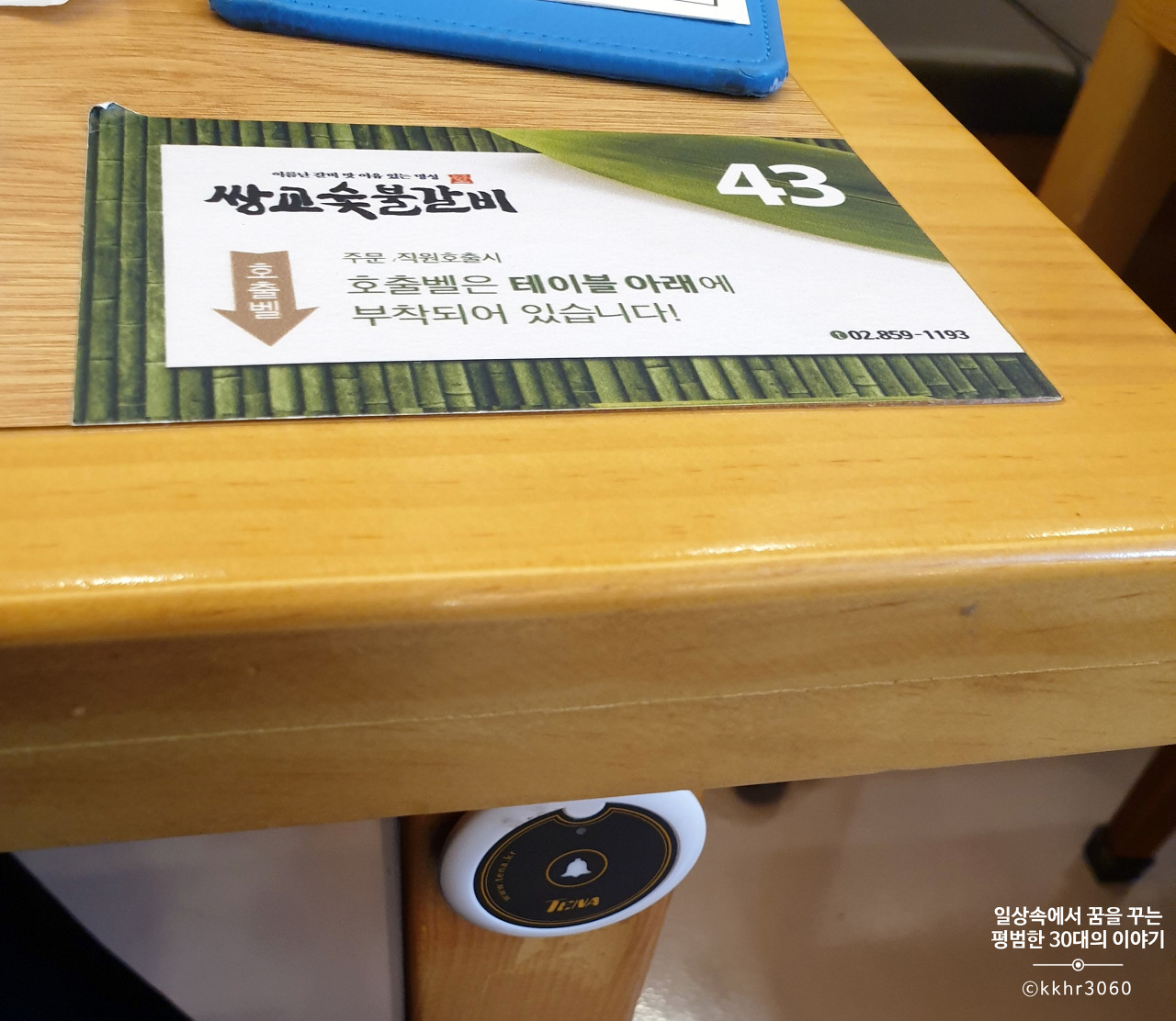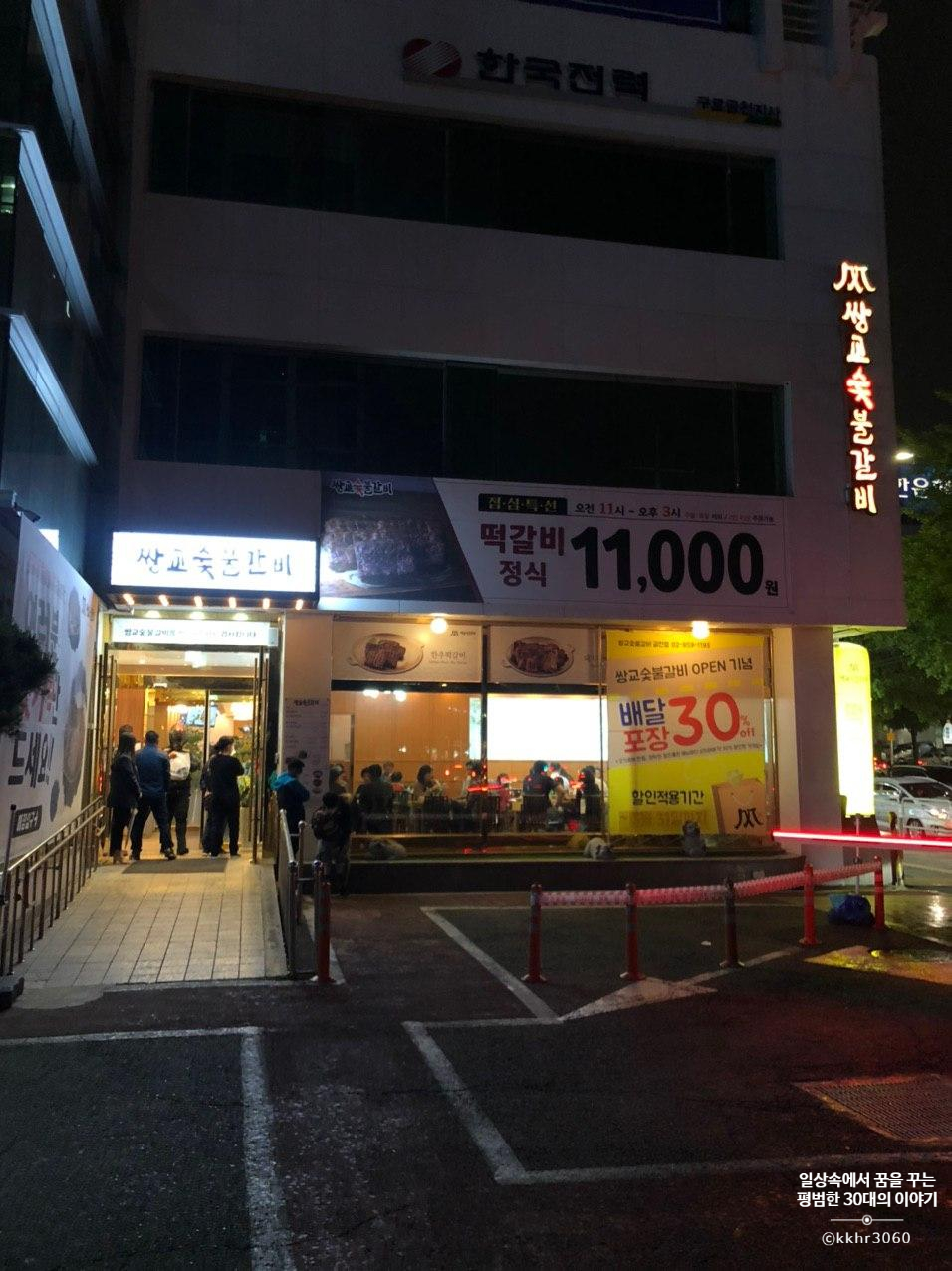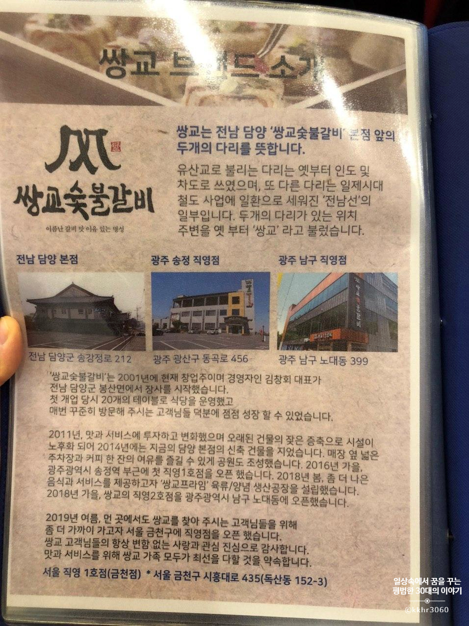 어버이날 동생을 빼고 나와 짝꿍만 부모님과 함께 저녁을 먹었다. 엄마 회사 근처에 갈만한 식당을 알아보다가 담양에 있는 쌍교 숯불갈비가 금천점을 최근에 개업한 것을 알게 되었다. 엄마가 좋아하는 고기 메뉴가 있는 몇몇 식당들 중에서 고민하던 중이었는데 매번 가던 곳 말고 새로운 곳을 시도해보는 것도 좋을 것 같아 쌍교 숯불갈비에 가기로 결정!! 비가 주룩주룩 내리던 날이어서 발에 금 간 짝꿍이 투덜거리긴 했으나 입이 더 이상 삐쭉 나오지 않게 잘 모시고(?) 집에서 택시를 타고 가려고 했으나 금요일 저녁인 데다 어버이날이라 길이 너무 막혀 결국 버스를 타고 갔다. 역시 막히는 날에는 버스가 최고!