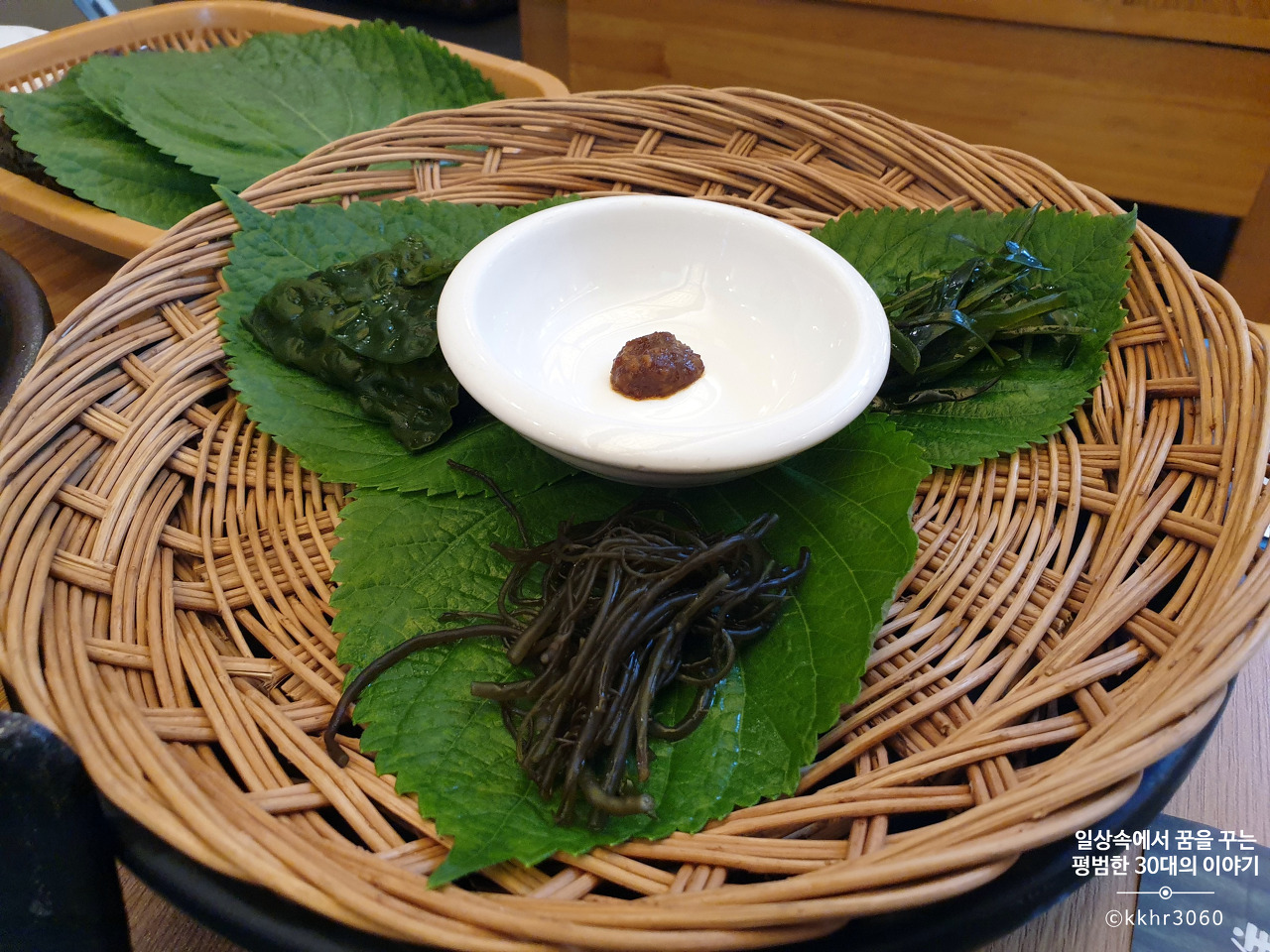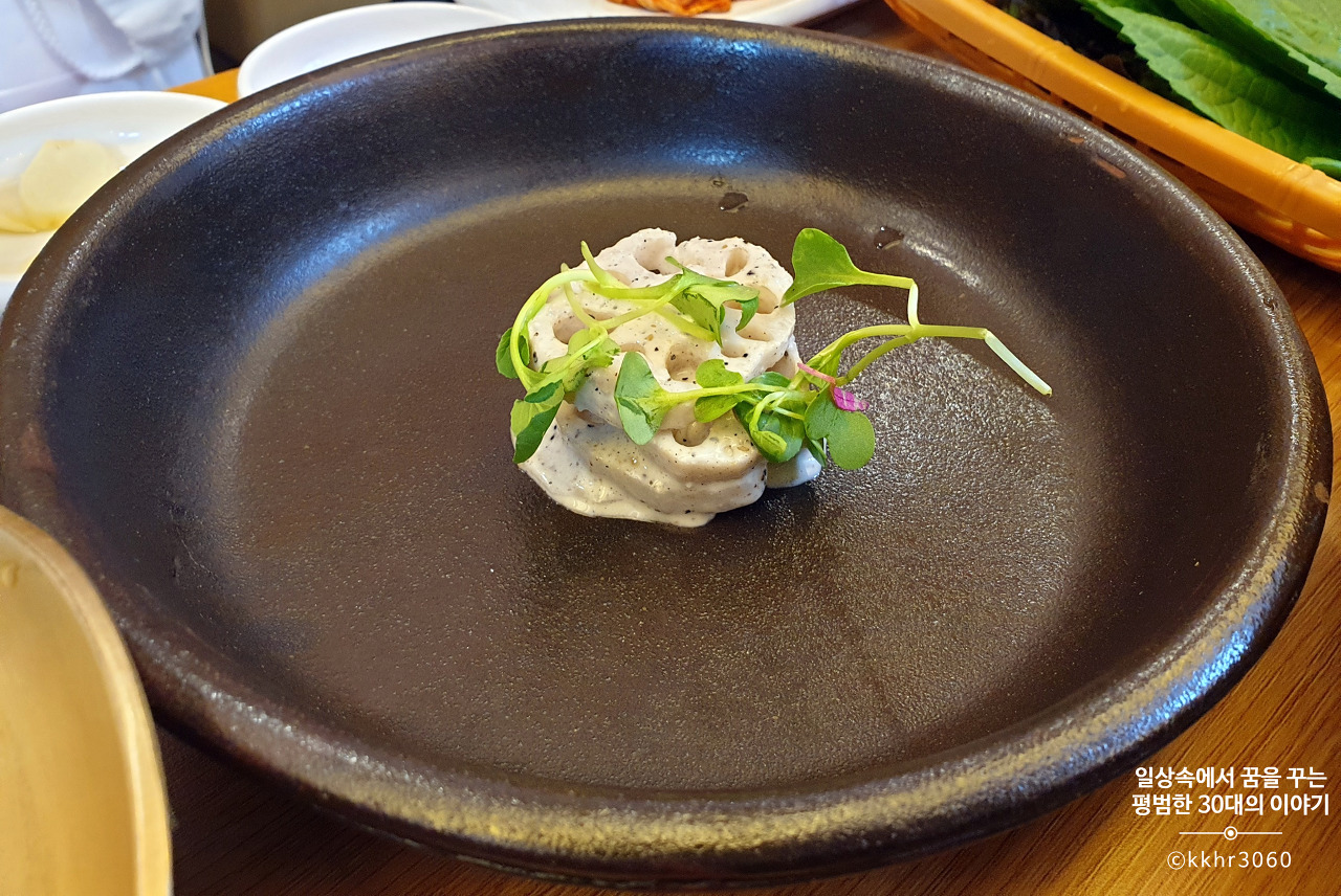 주문한 지 얼마 지나지 않아 큰 접시에 가지각색의 반찬이 예쁘게 담긴 접시가 테이블 위에 놓였다. 반찬을 워낙 조금씩 주셔서 몇 번 리필을 했는데 호출벨이 테이블 옆 쪽이 아닌 앞 쪽 밑에 있어서 안내 문구가 없었으면 찾지 못했을 뻔했다.
