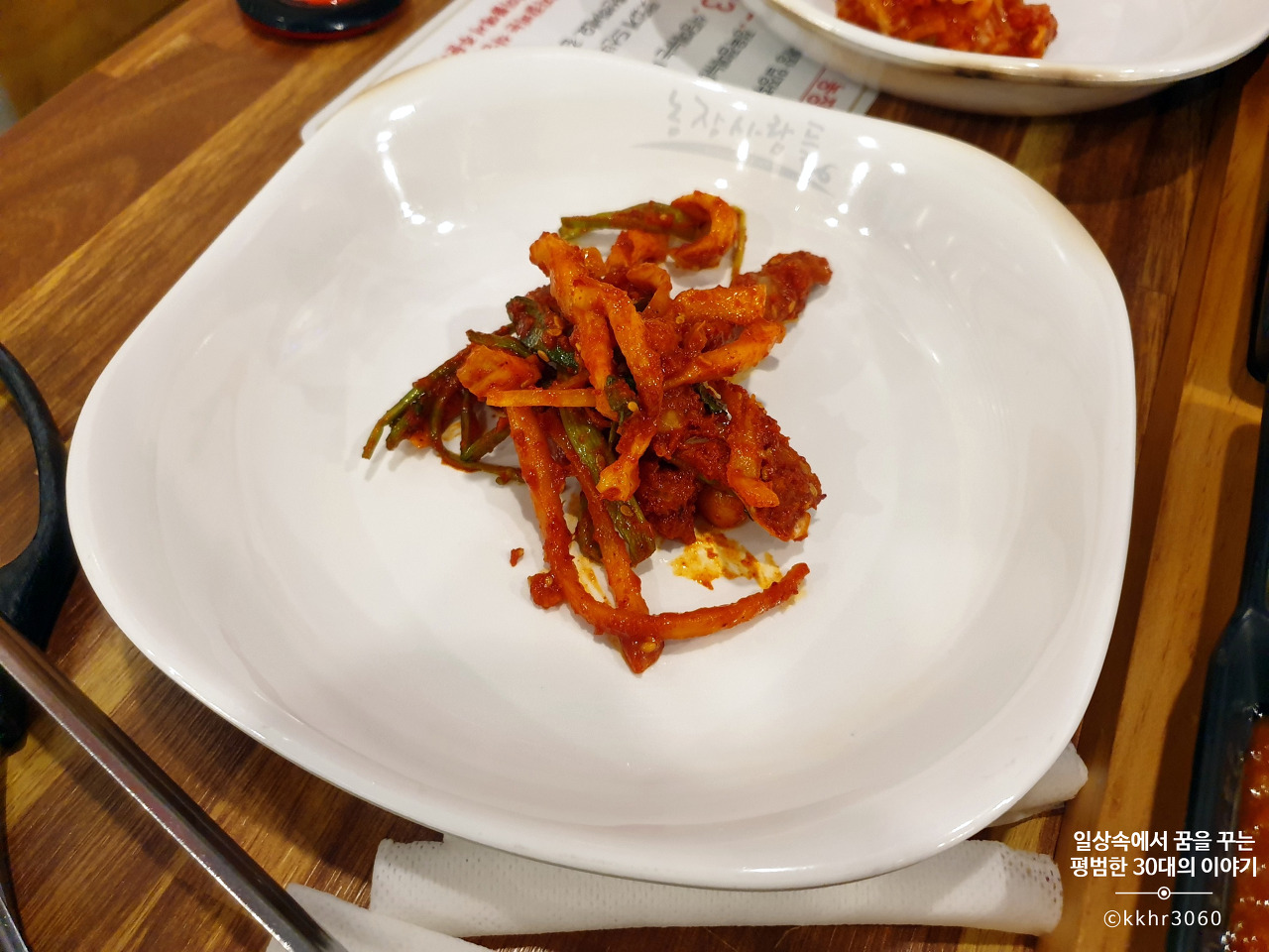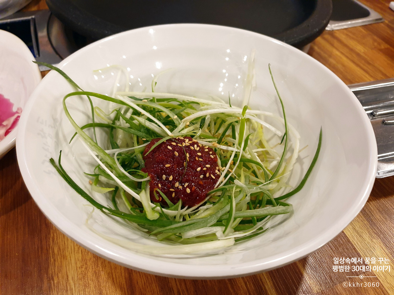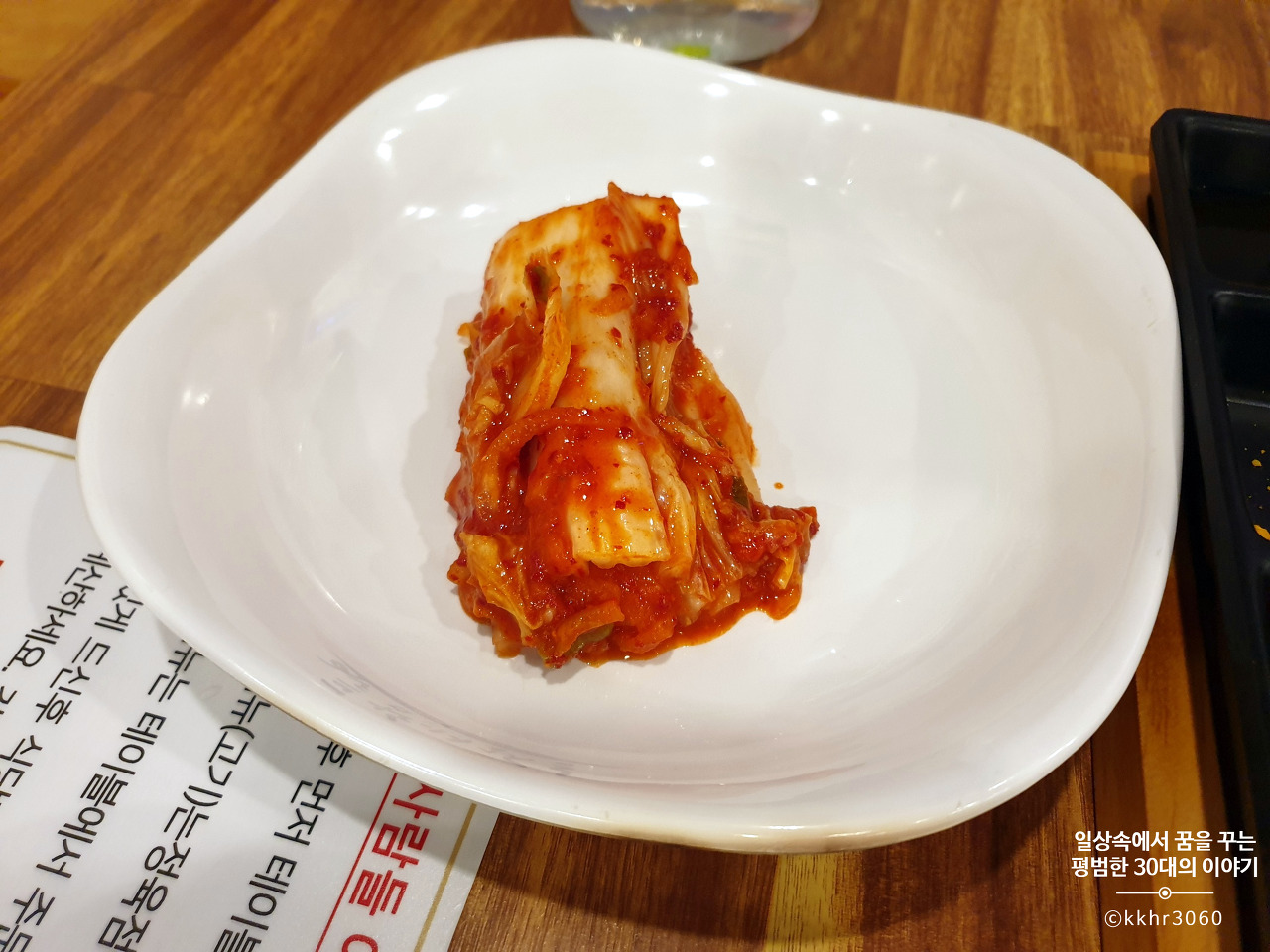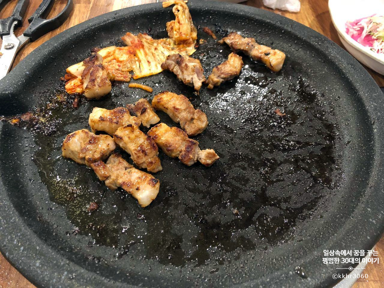 차돌박이를 먼저 구워 먹고 나서 삼겹살을 구워 먹었는데 먹느라 정신이 없어 사진을 제대로 못 찍었다. 구운 김치에 삼겹살 싸먹는 걸 좋아하는 짝꿍을 위해 김치는 돼지기름에 필수로 구워줘야 한다. 짝꿍 말로는 본인이 여태 한국에서 먹었던 삼겹살들을 떠올려보면 맛이 있는 편은 아니라고 하기에 내가 원래 삼겹살 맛이 이렇다고 짝꿍이 그동안 먹었던 삼겹살은 전문가가 구워줘서 더 맛있었던 것도 있고 비싼 삼겹살에 속하는 삼겹살이어서 더 맛있었던 거라고 했다. 보통 그런 삼겹살집에서 술을 한 방울도 안 마시는 우리 둘이 배부르게 먹으면 5~6만 원은 기본으로 나온다. 어쨌든 여기 삼겹살도 나쁘지는 않았다. 가성비 괜찮은 식당인 듯. 상추도 신선했고 반찬도 나쁘지 않았다. 물론 반찬이 맛을 평가하기 다소 어려운 파절이, 김치, 샐러드 그리고 절임류가 대부분이었지만 말이다.