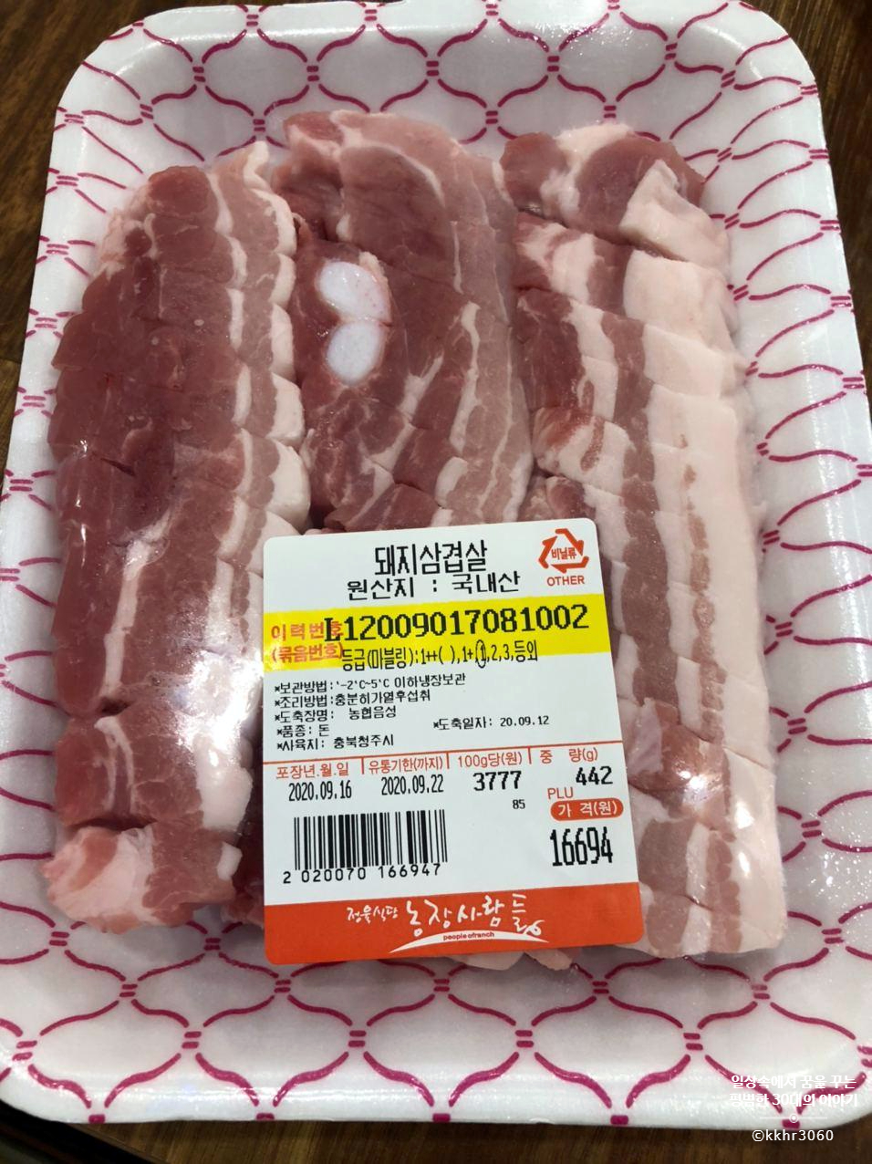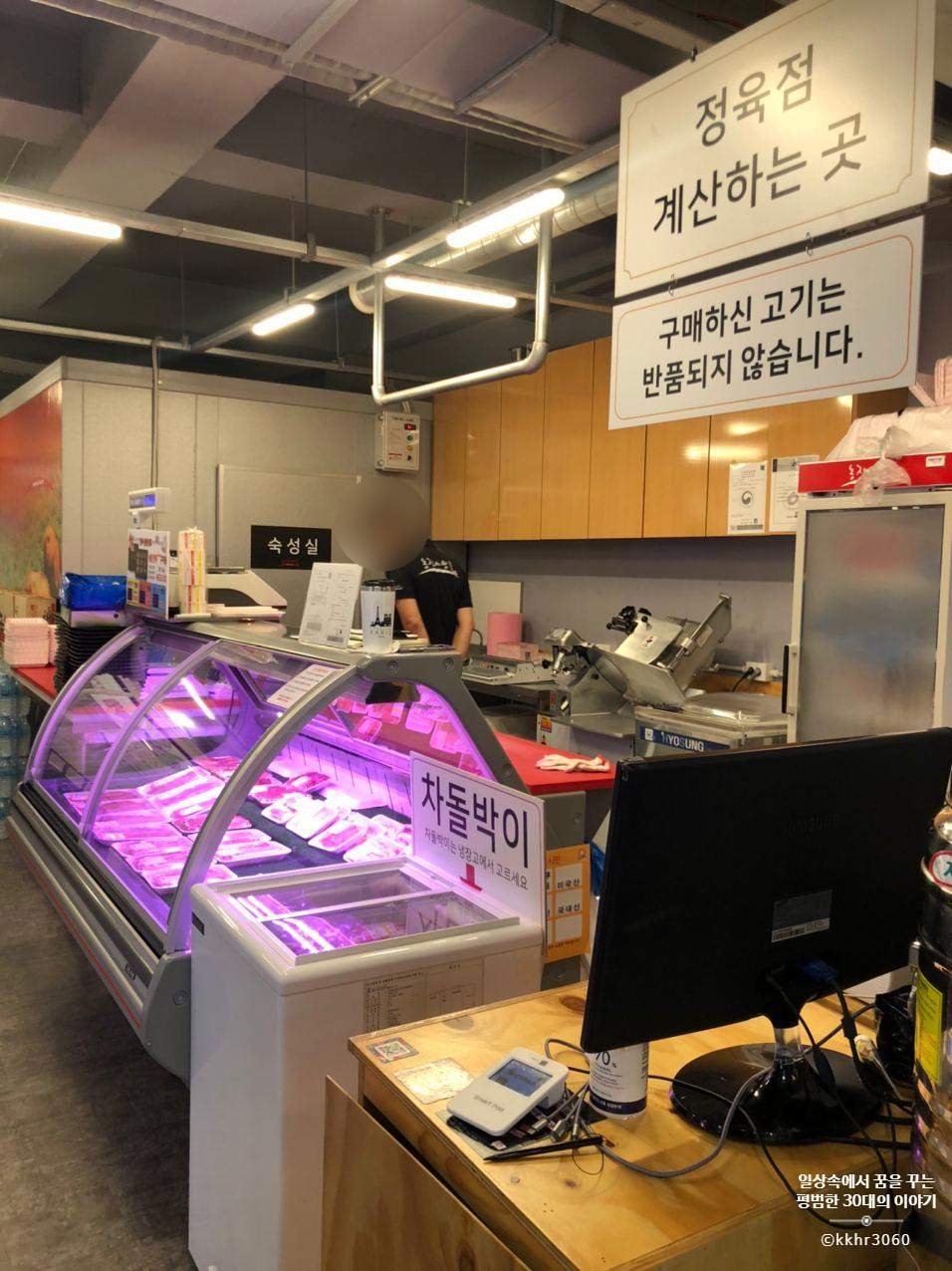 이 식당은 정육점 식당이기 때문에 정육점에서 우선 고기를 구매한 뒤 테이블로 가져가서 구워 먹으면 된다. 어차피 삼겹살을 먹으러 온 것이기 때문에 상관은 없었지만 코로나 때문인지 평일 저녁이어서 그런지 고기 종류가 다양하진 않았다. 삼겹살만 먹기엔 아쉬워서 차돌박이도 함께 샀다.